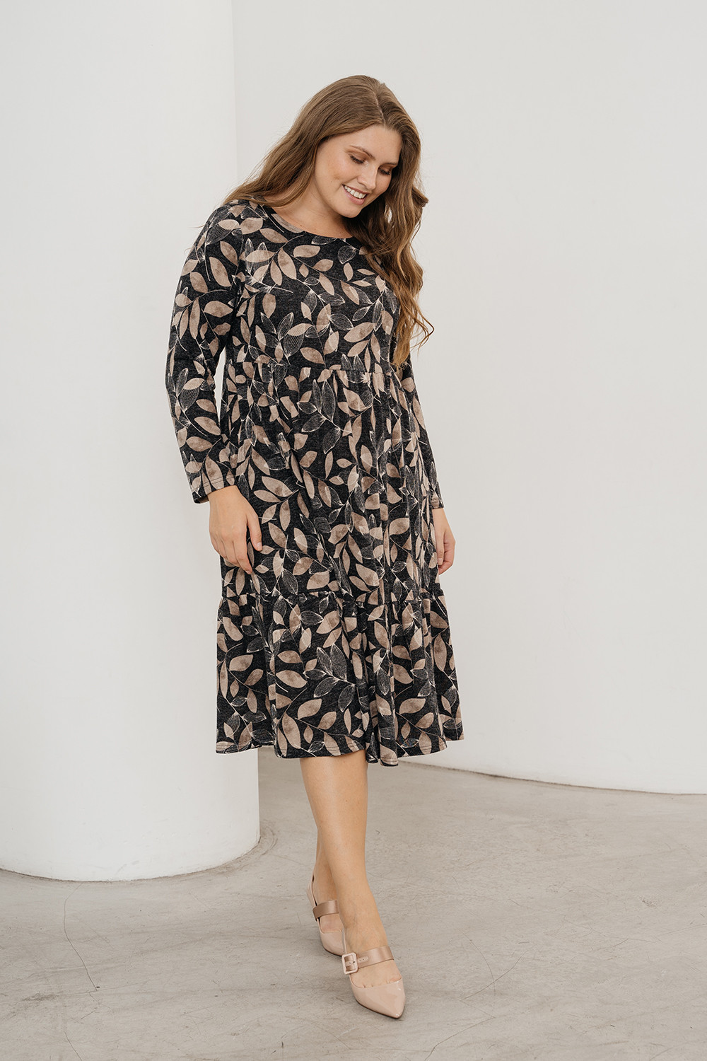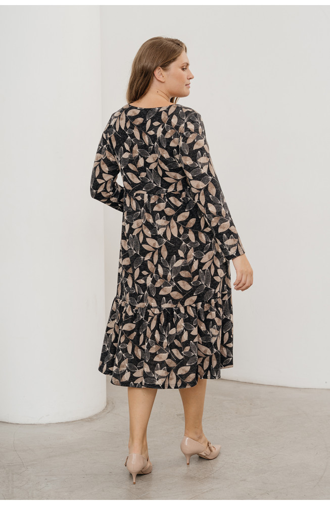 Описание: Платье из мягкого трикотажа "ангора" с принтом "листья" трапецевидного силуэта с подрезом под грудью, длинными рукавами и нижней частью, состоящей из двух ярусов со сборками. Платье длиной до середины голени.