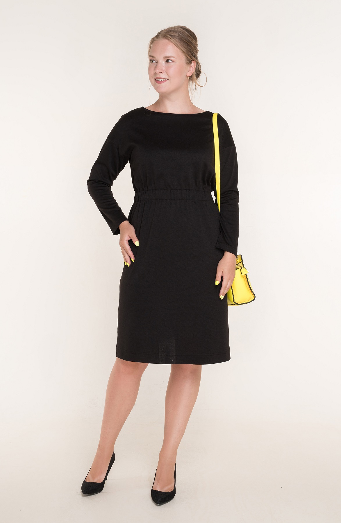 Описание: Платье из плотного трикотажа джерси прямого силуэта на резинке по талии с длинными рукавами на спущенном плече и округлым вырезом горловины.