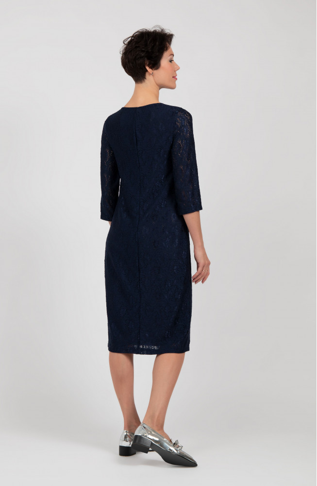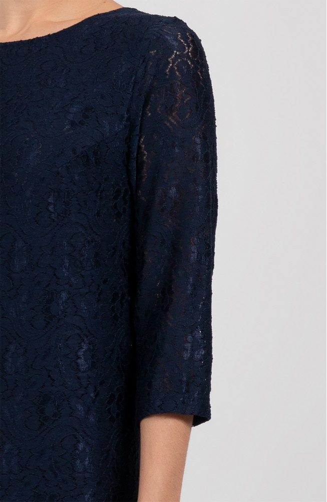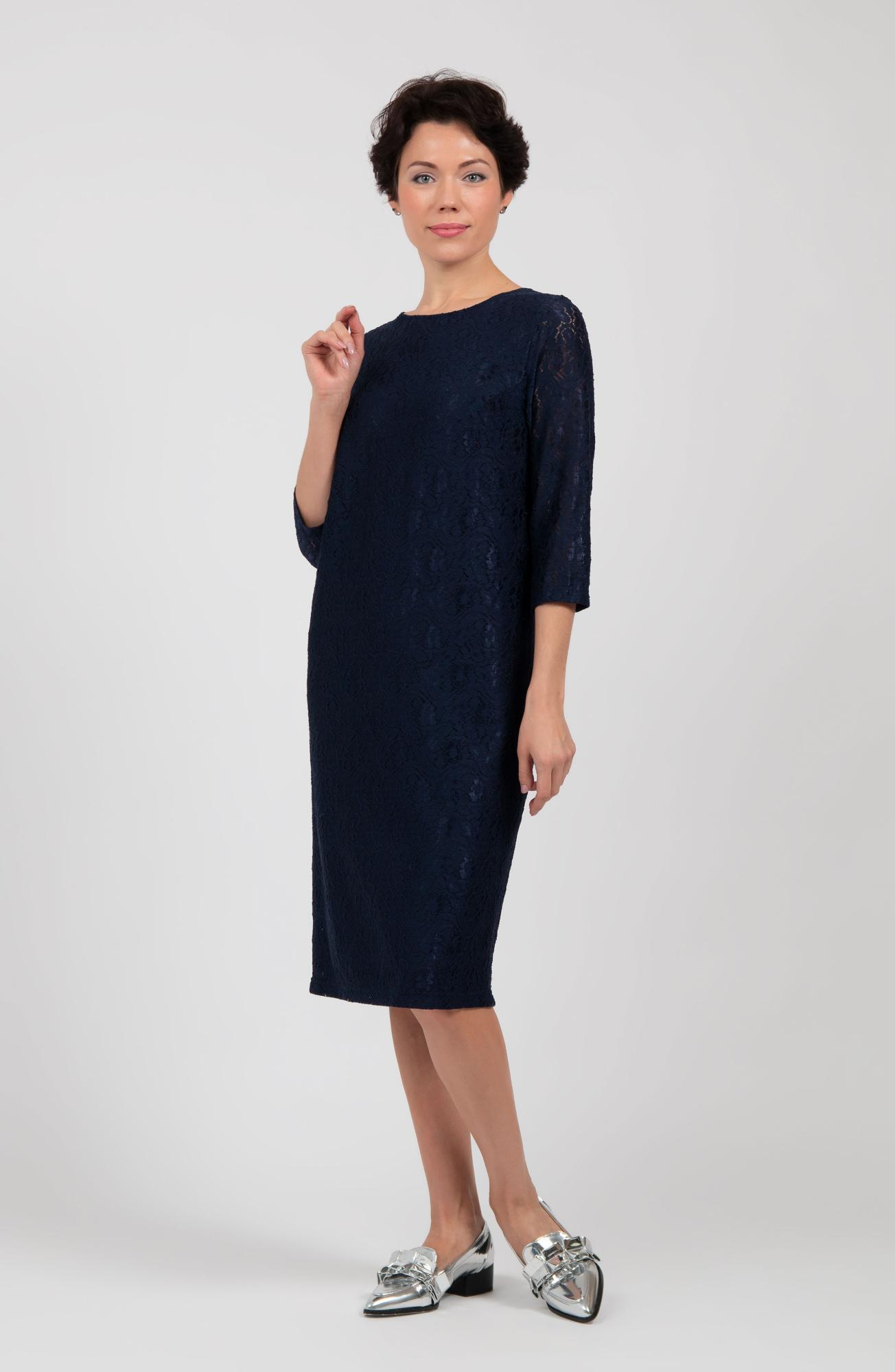 Описание: Платье из гипюра на подкладке полуприлегающего силуэта с округлым вырезом горловины и рукавами 3/4. Длина - ниже колена