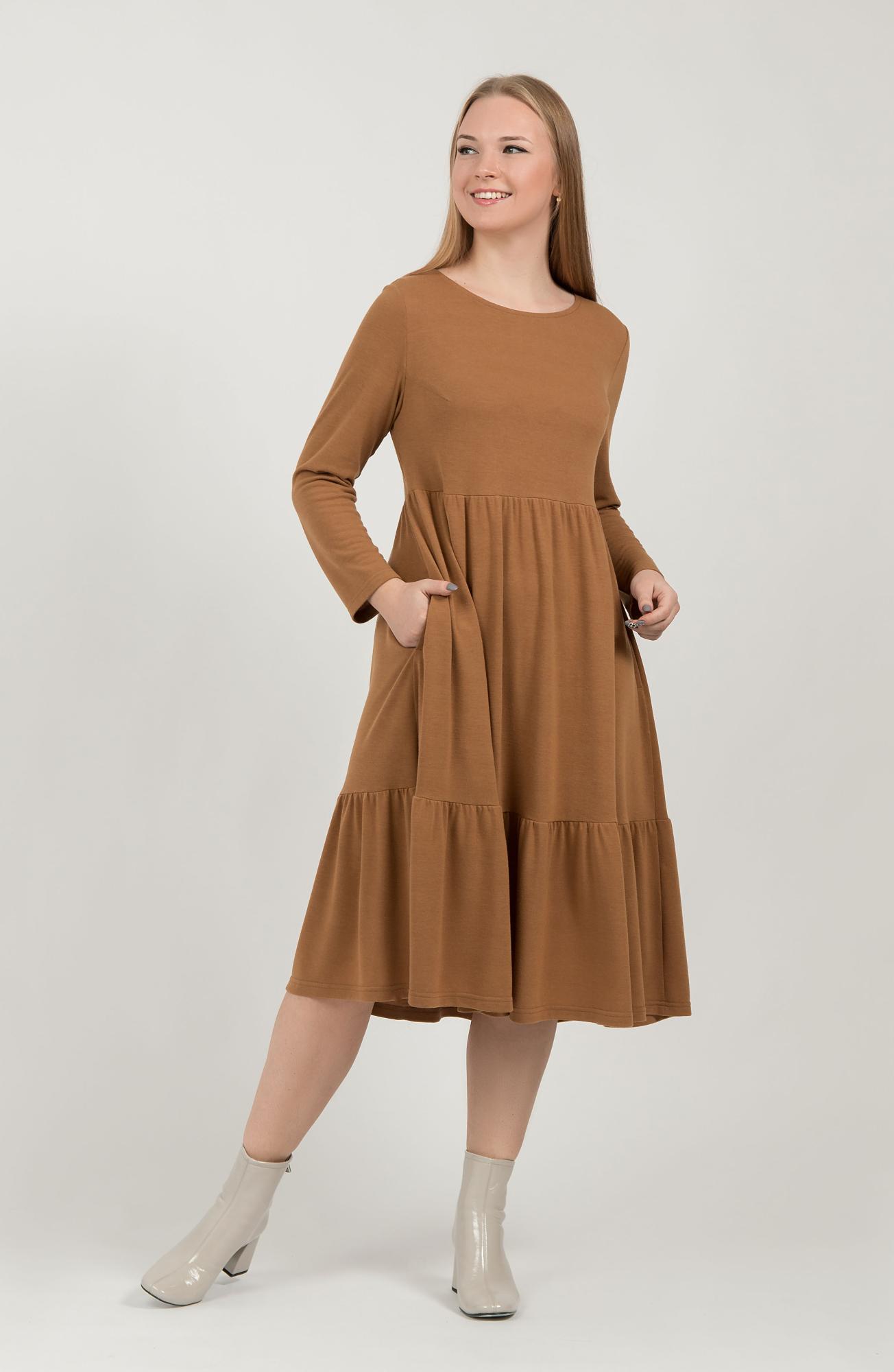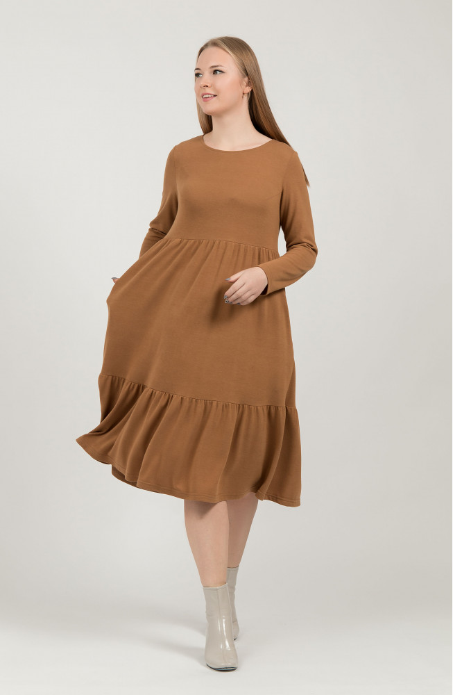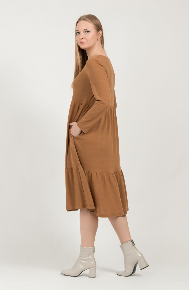 Описание: Платье из вязаного трикотажа трапецевидного силуэта с подрезом под грудью, длинными рукавами и нижней частью состоящей из двух ярусов со сборками.