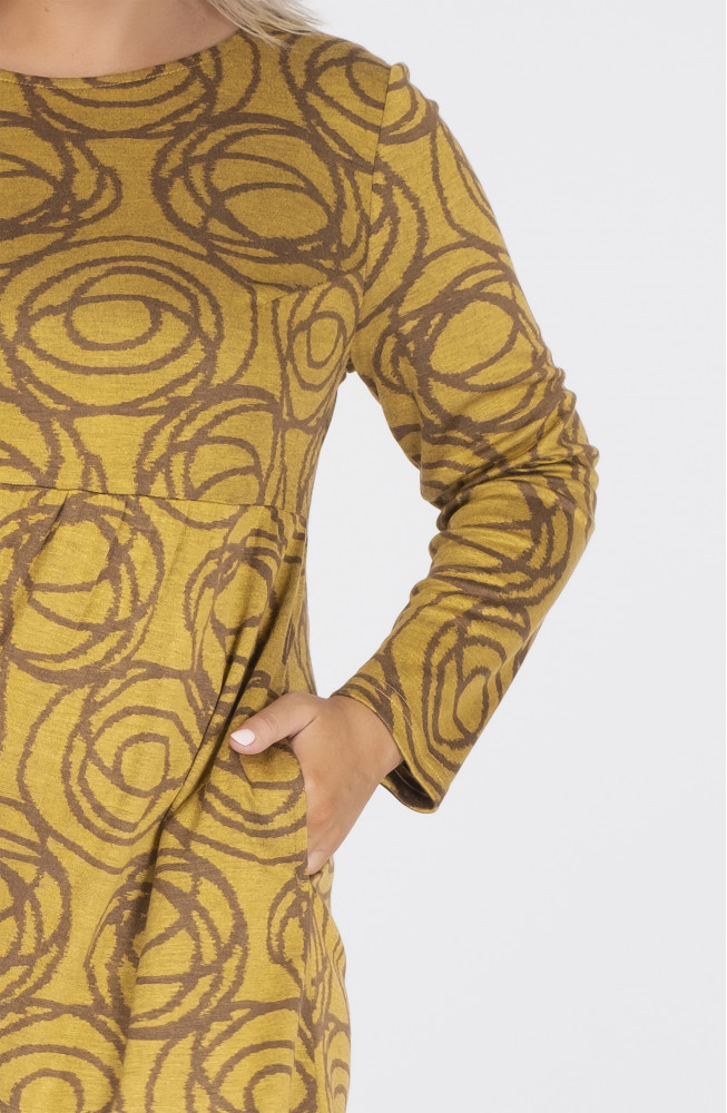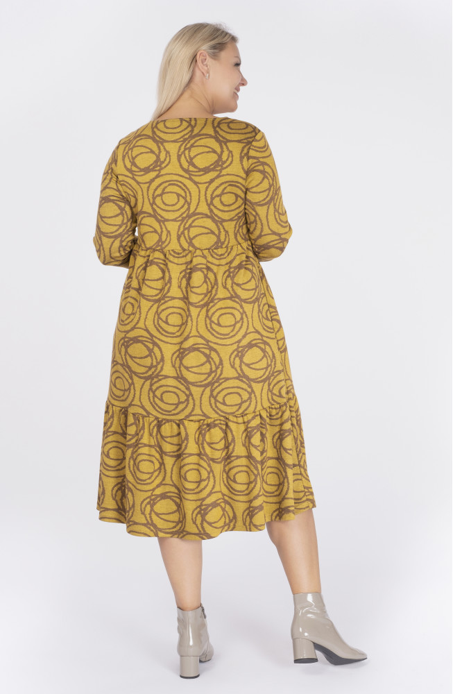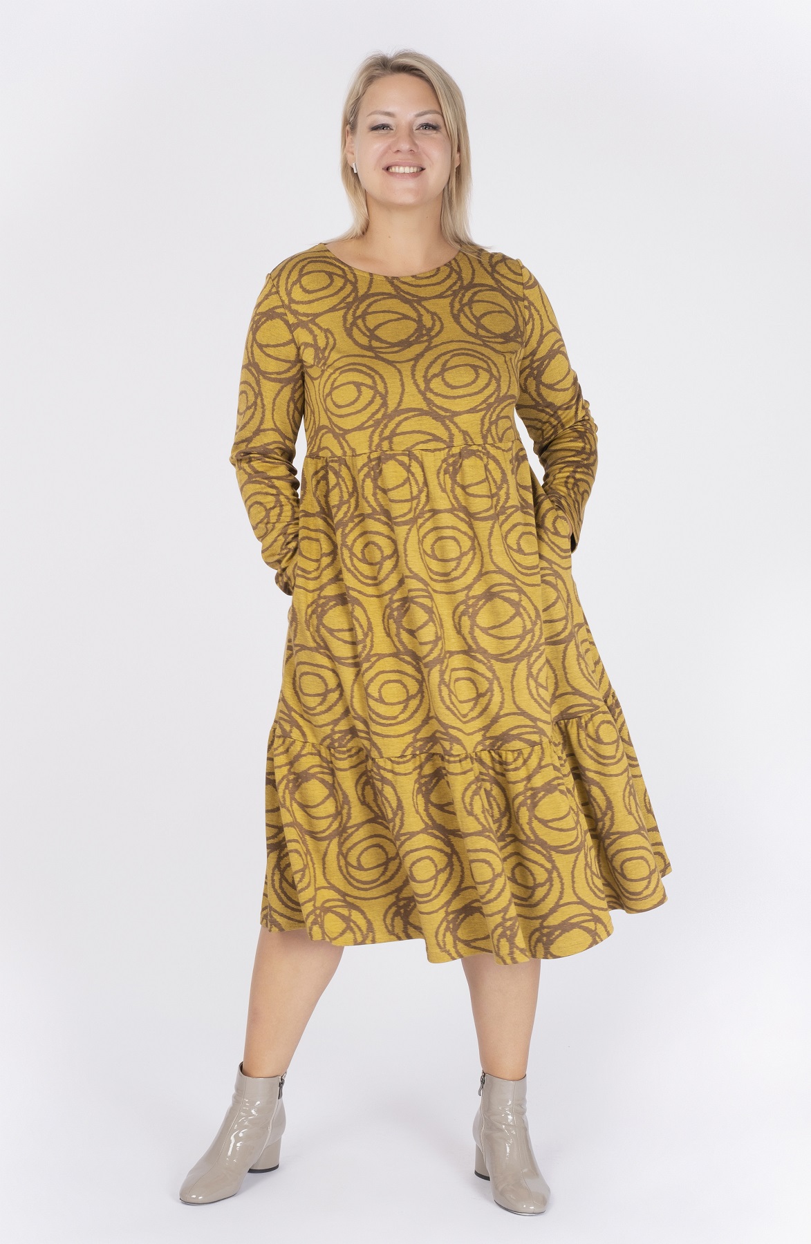 Описание: Платье из плотного вискозного трикотажа трапецевидного силуэта с подрезом под грудью, длинными рукавами и нижней частью, состоящей из двух ярусов со сборками.