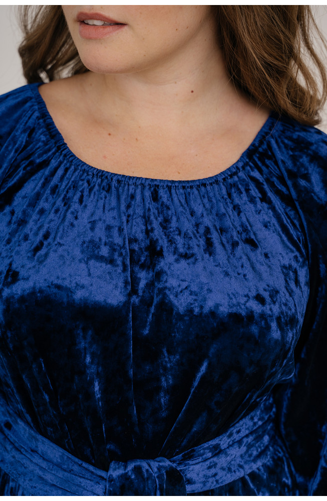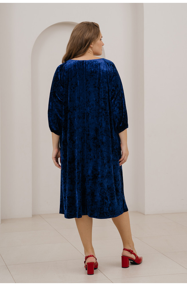 Описание: Платье из мраморного бархата трапецевидного силуэта с поясом-кушаком на талии с округлым вырезом горловины с присборкой на резинку и с длинными рукавами-реглан присборенными на резинку по низу.Платье длиной ниже колена.