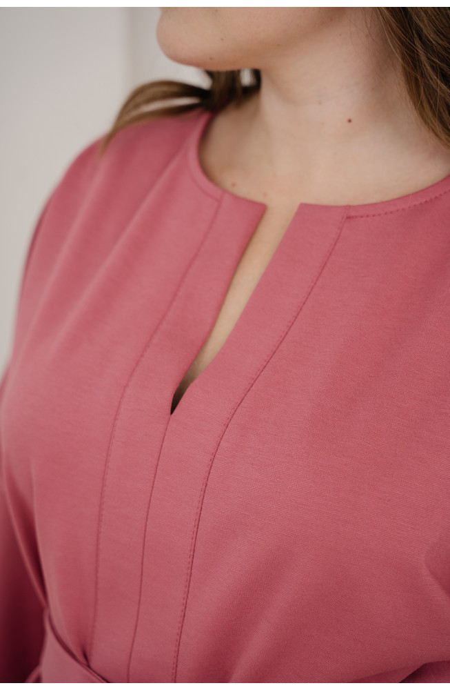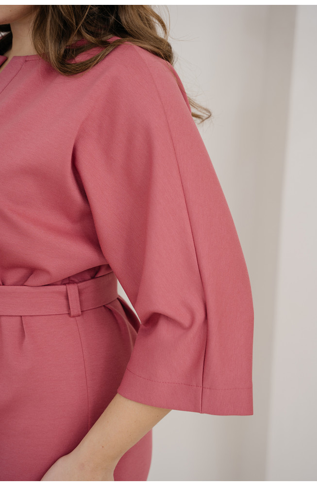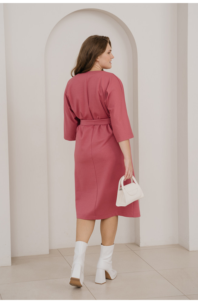 Описание: Платье из плотного трикотажа джерси полуприлегающего силуэта с широкими цельнокроенными рукавами длиной 3/4, с округлым вырезом горловины с разрезом, с разрезом по низу спереди и с вертикальными планками по центру переда. Талию подчеркивает пояс-кушак, платье длиной до середины голени.