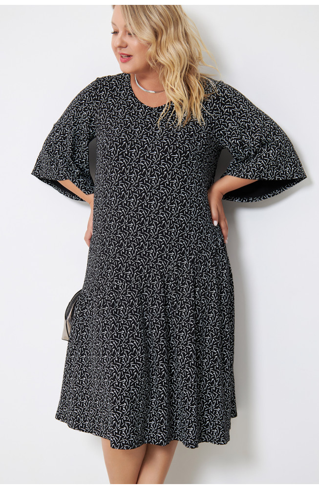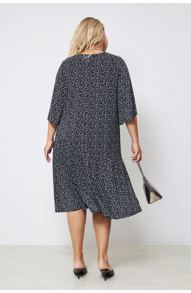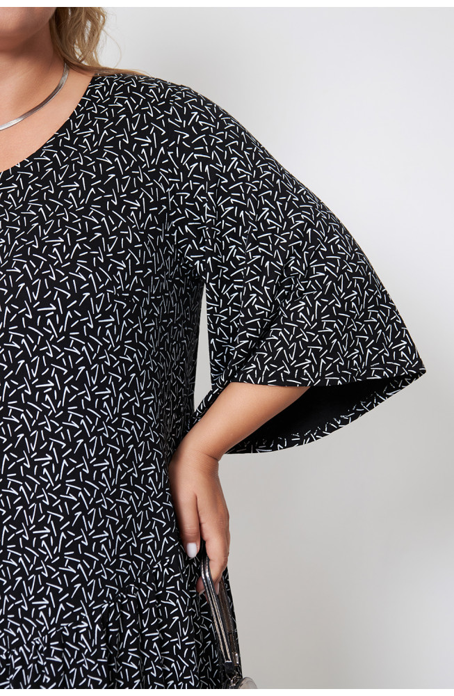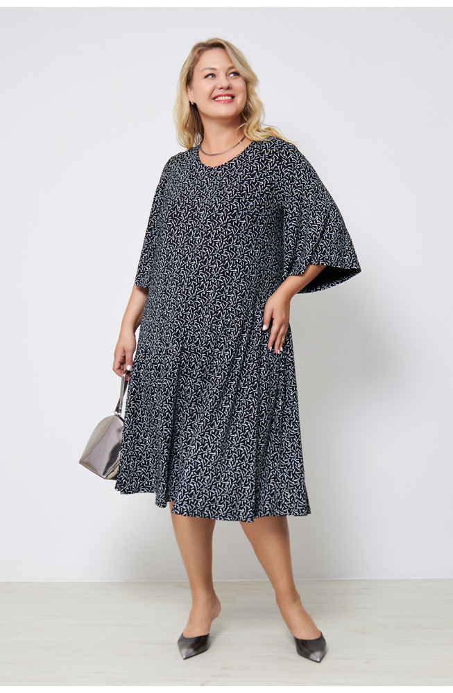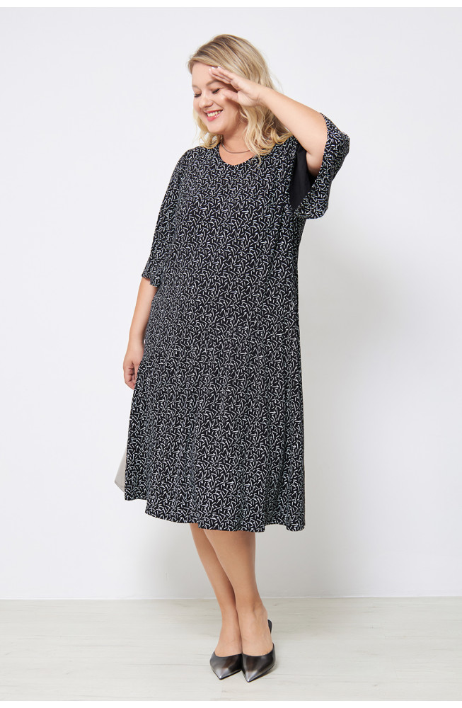 Описание: Платье из  тонкого вискозного трикотажного полотна с абстрактным принтом, прямого силуэта с ассиметричным подрезом от линии бедер, V- образным вырезом, втачным, расширенным к низу рукавом.