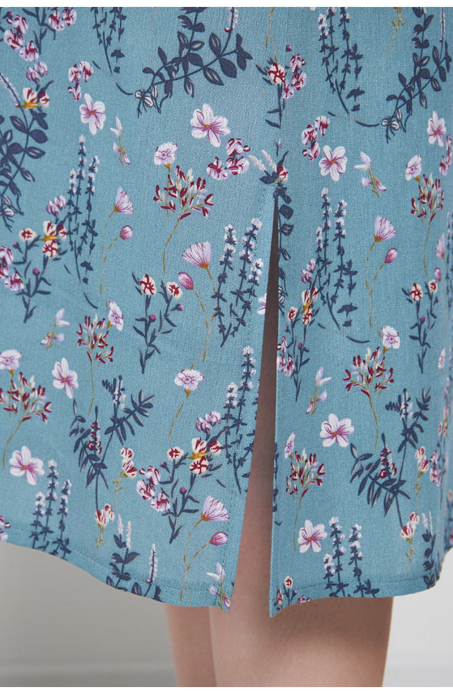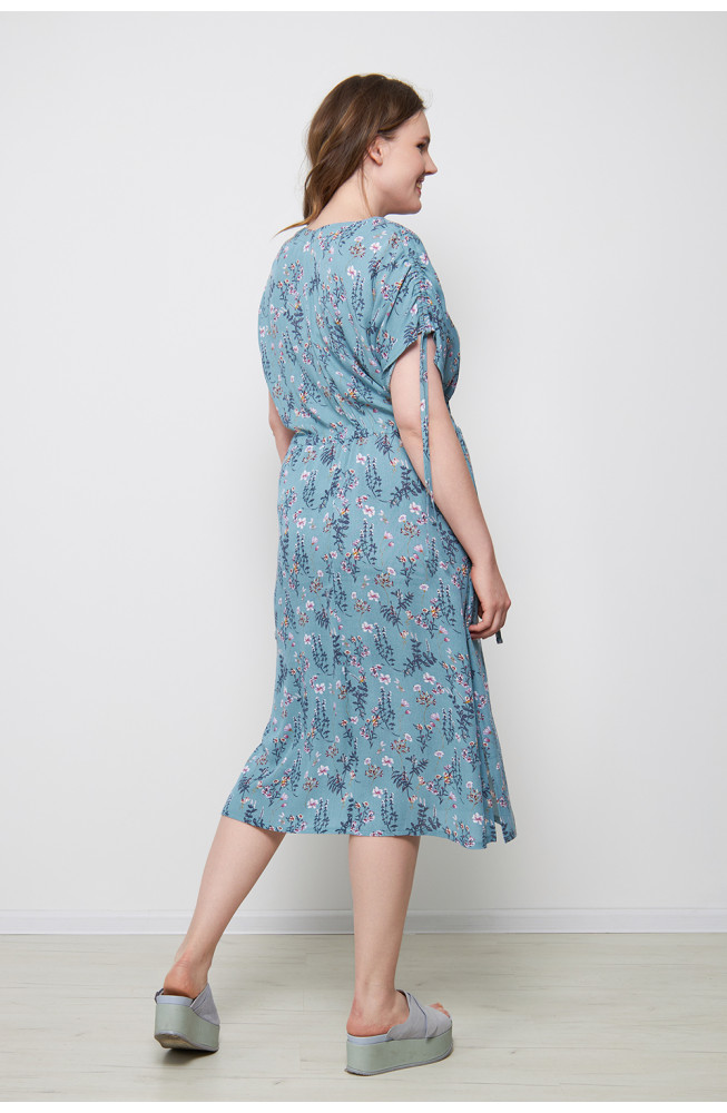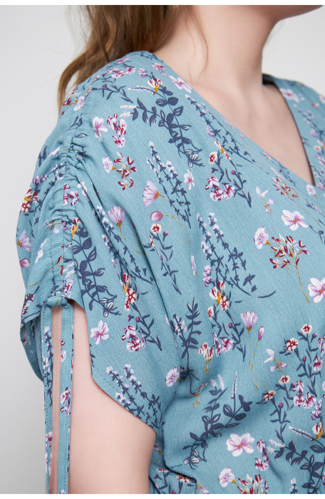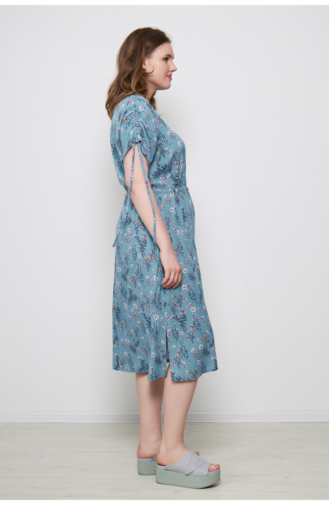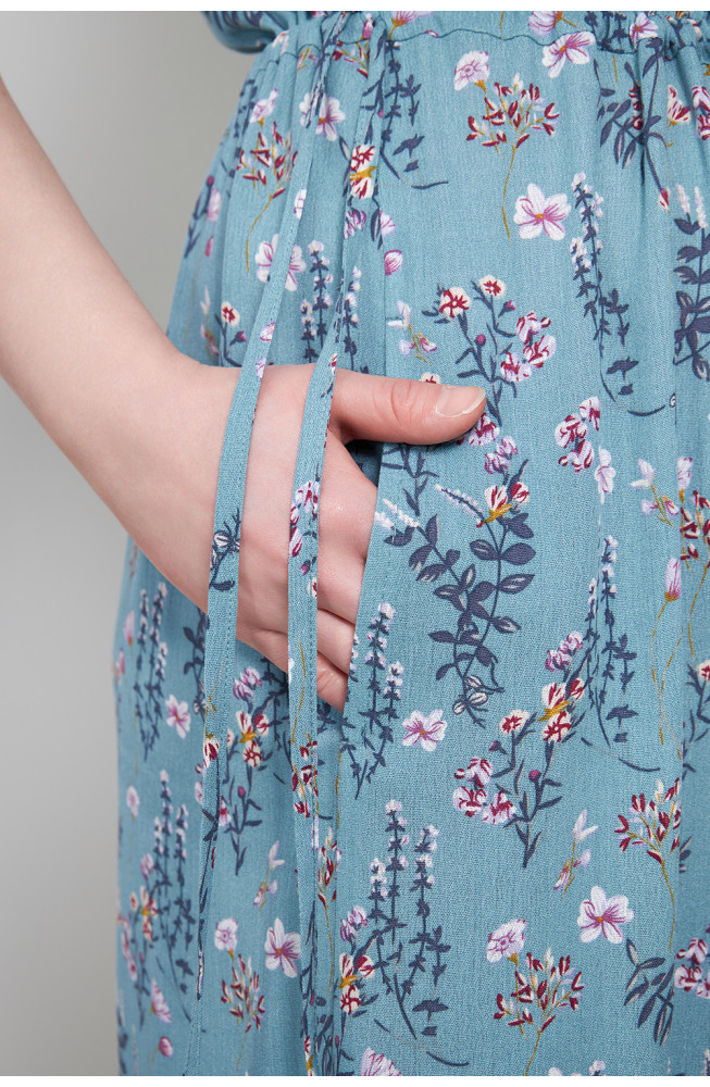 Описание: Платье из вискозной ткани марлевка с цветочным принтом прямого силуэта сцельнокроенными короткими рукавами, V-образным вырезом горловины, на кулисках по плечам и по талии, с карманами в боковых швах и разрезами по бокам.