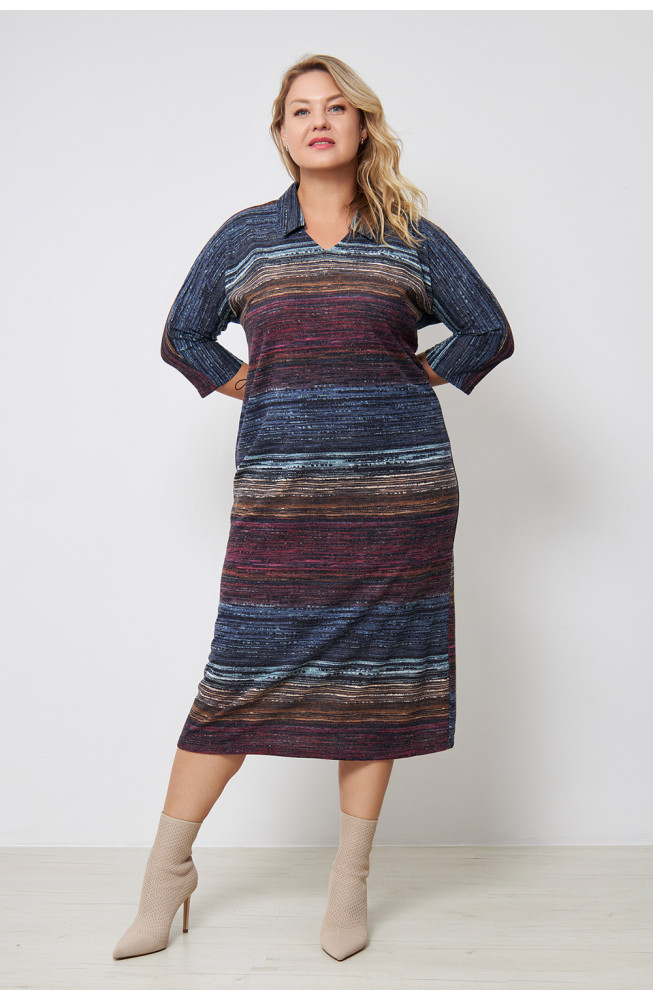 Описание: Платье из плотного трикотажа-ангора "полоска" , полуприлегающего силуэта с V-образным вырезом горловины и цельнокроенными рукавами 3/4. Талию подчеркивает ремешок из основной ткани.