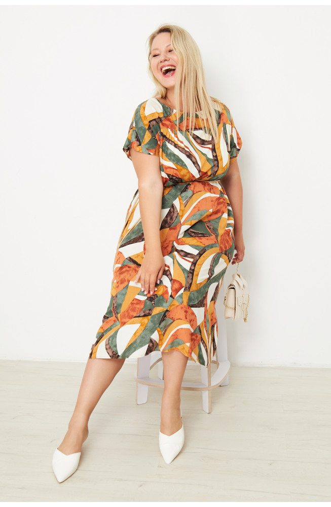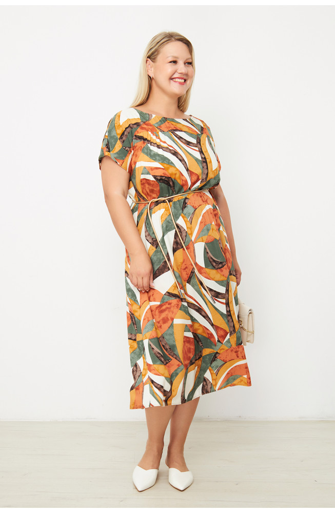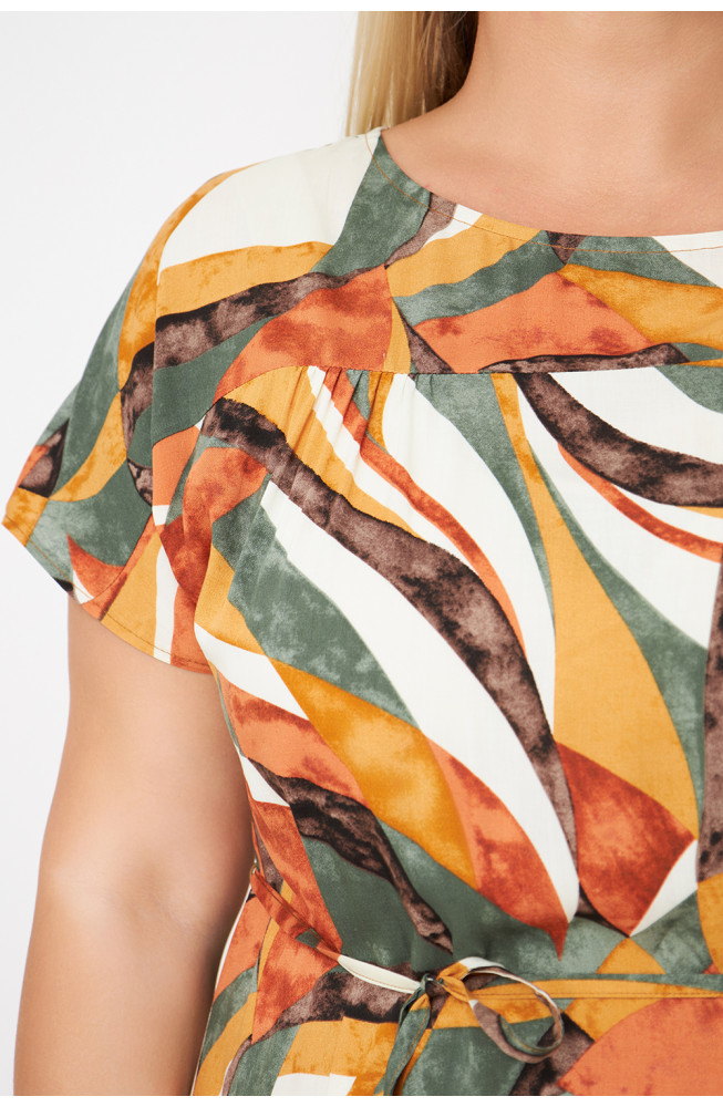 Описание: Платье из вискозной ткани "штапель" А-силуэта с подрезом над грудью со сборками по груди. Рукава короткие цельнокроенные, талию подчеркивает контрастный ремешок.