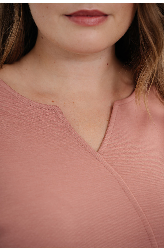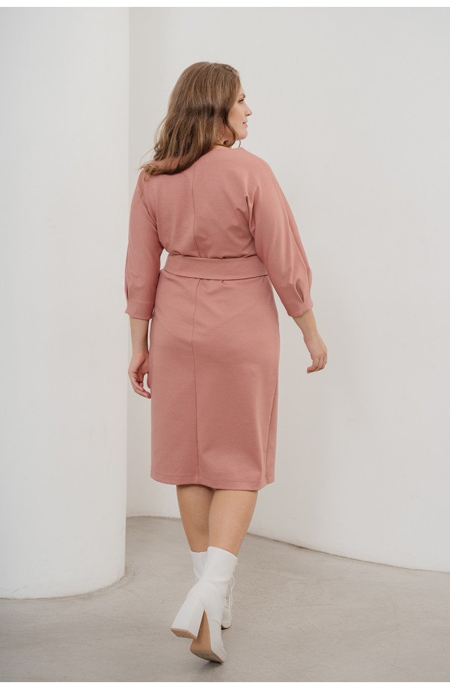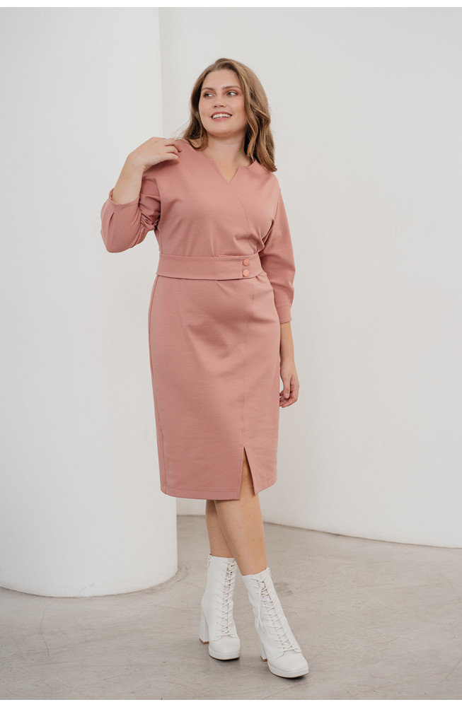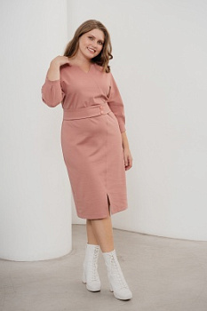 Описание: Трикотажное платье, женское, полуприлегающее, платье ниже колена, с имитацией запаха. Стильное платье, рукава цельнокроенные 3/4, с защипами по низу, горловина округлая с "галочкой", спереди платья по низу разрез, талию подчеркивает отдельный пояс на пуговицах.