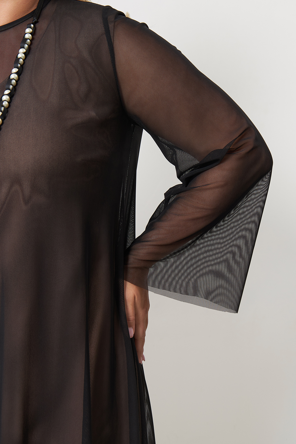 Описание:Платье из сетки А-силуэта, длиной ниже колена. Рукава втачные, длинные, расклешенные к низу.Горловина у платья круглая, обработана окантовкой.