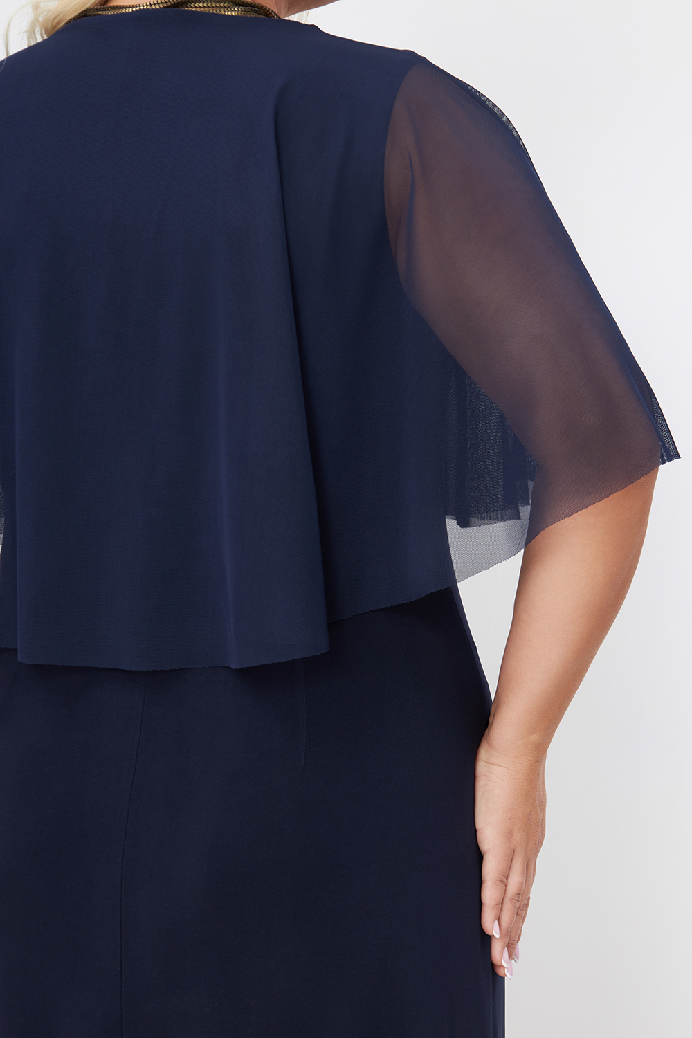 Описание: Платье из тонкого трикотажа приталенного силуэта клешеное к низу с декоративной пелериной из сетки ниспадающей по плечам.