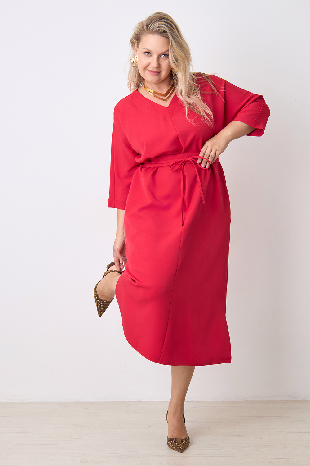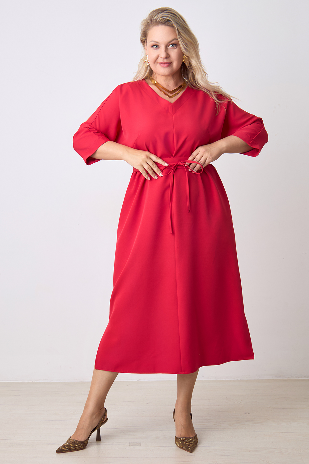 Описание: Платье прямого силуэта с цельнокроенным рукавом длиной 3/4, V- образным вырезом горловины, с декоративным швом по центру переда, карманами в боковых швах и разрезами по бокам с двух сторон. В комплекте фигурный пояс из основной ткани.