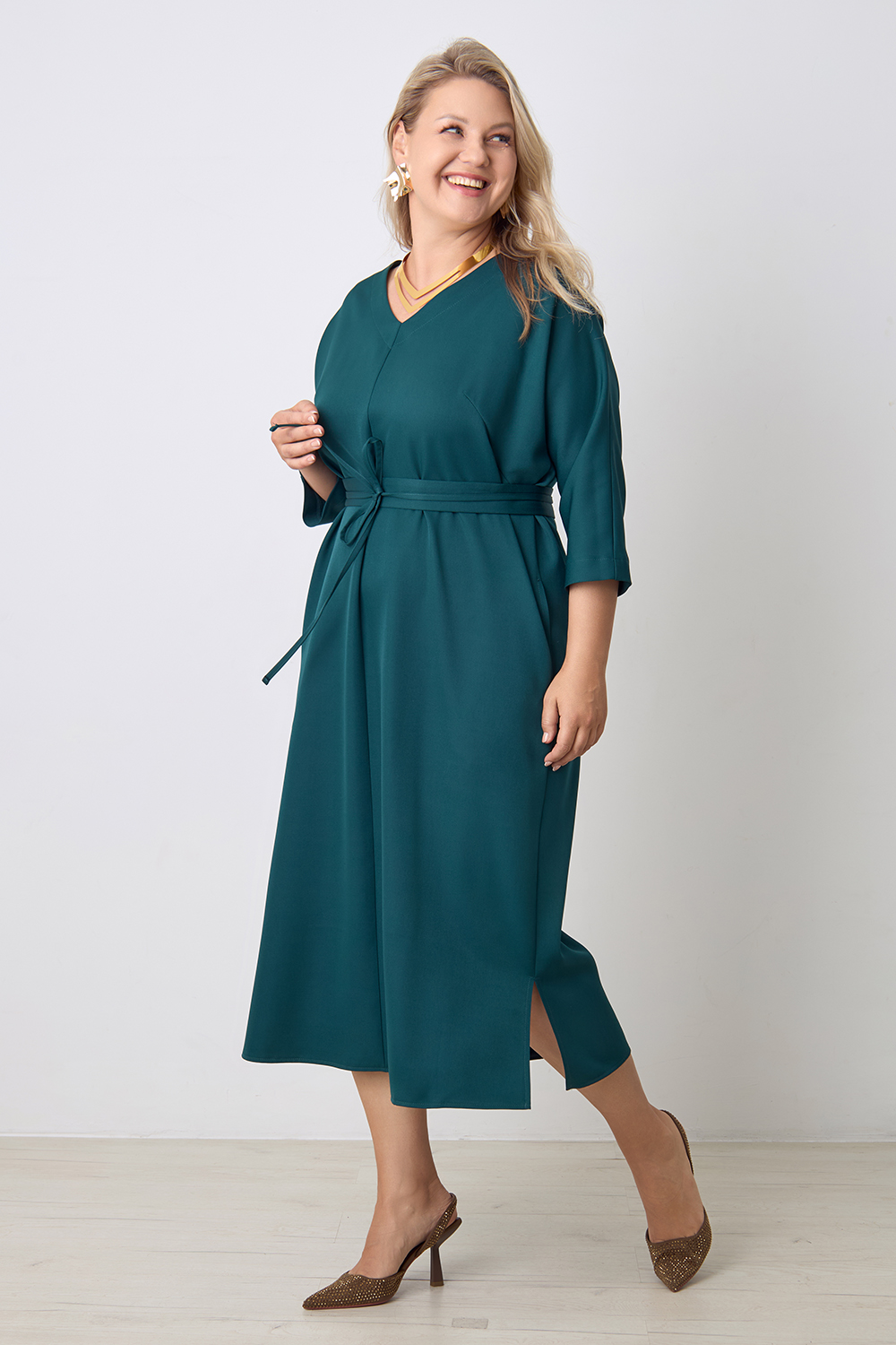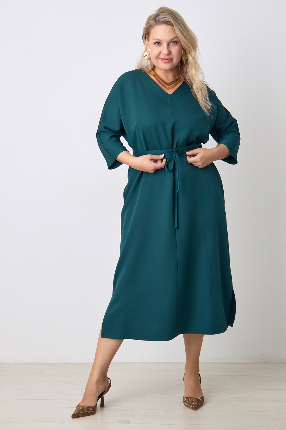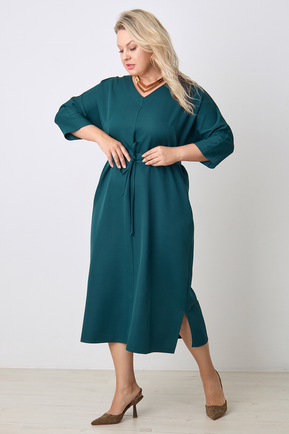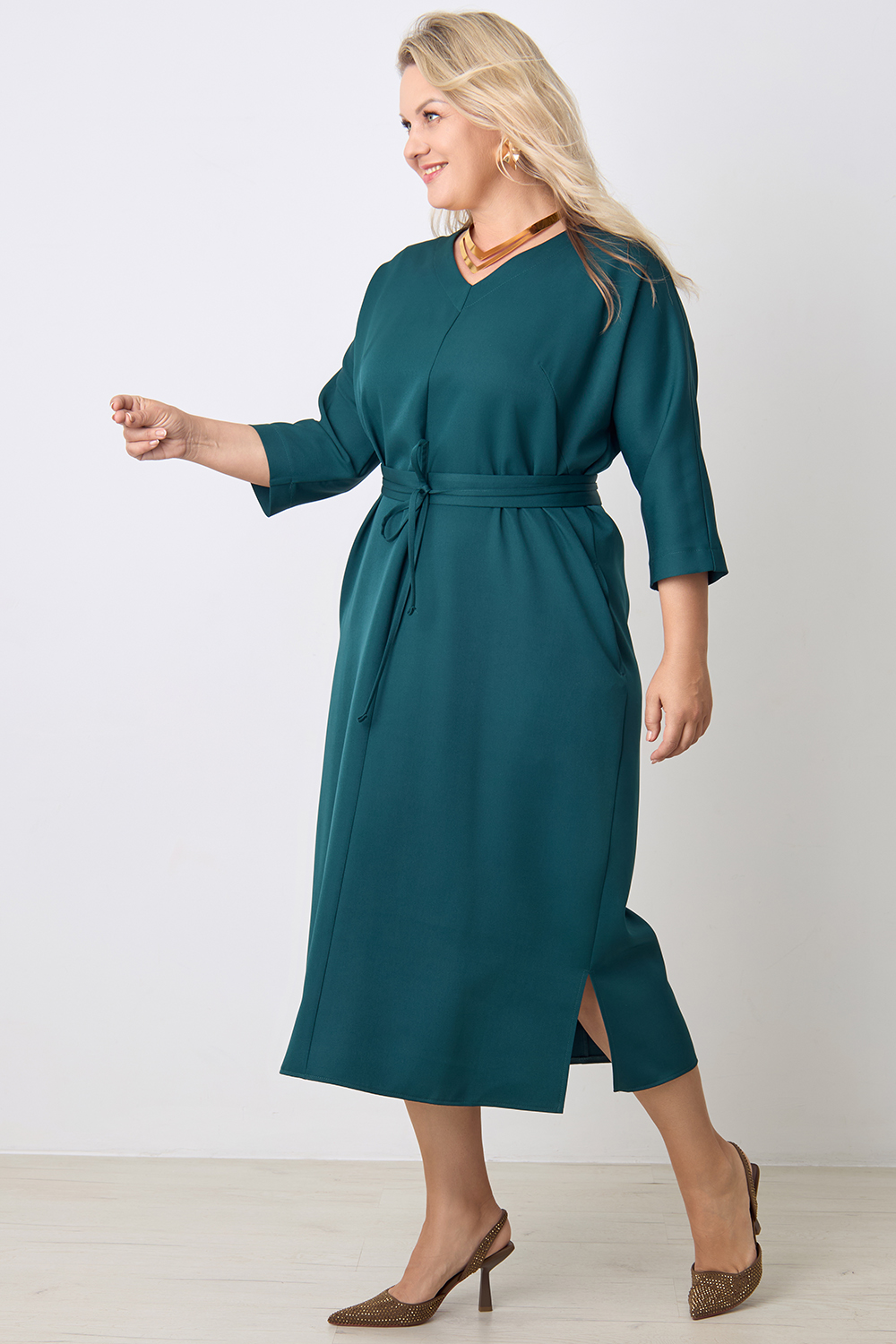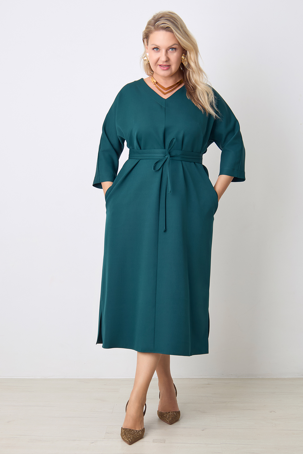 Описание: Платье прямого силуэта с цельнокроенным рукавом длиной 3/4, V- образным вырезом горловины, с декоративным швом по центру переда, карманами в боковых швах и разрезами по бокам с двух сторон. В комплекте фигурный пояс из основной ткани.
