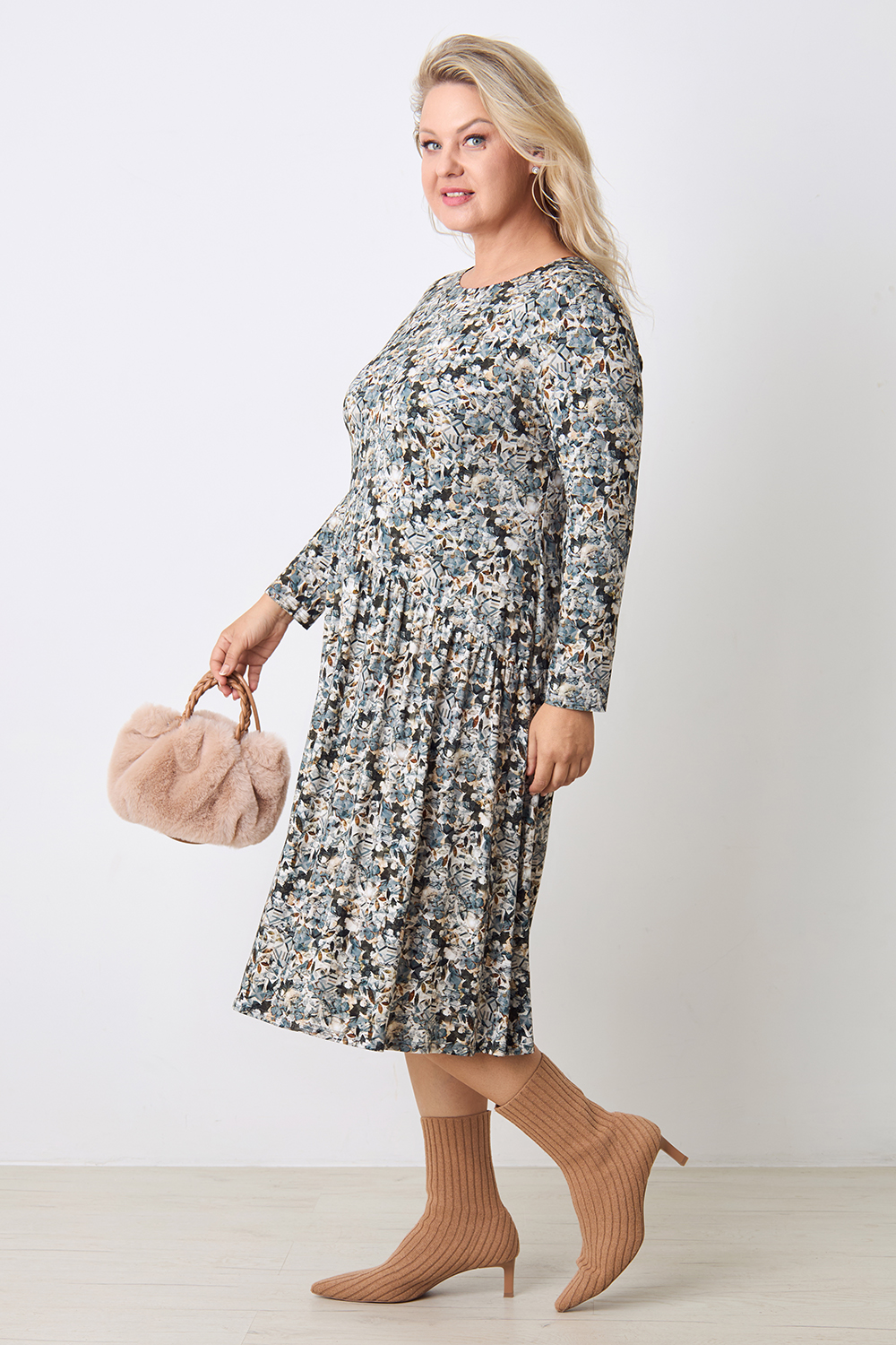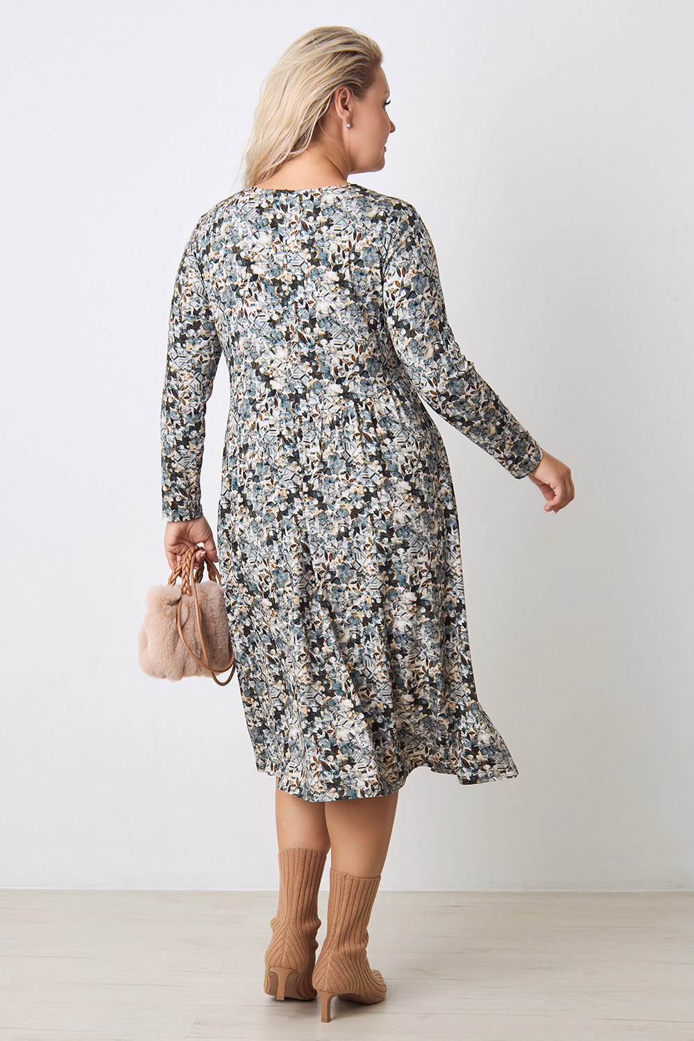 Описание: Платье из тонкого вискозного трикотажа полуприлегающего силуэта с асимметричным подрезом по талии со сборками по нижней части. Вырез горловины округлый, рукава длинные