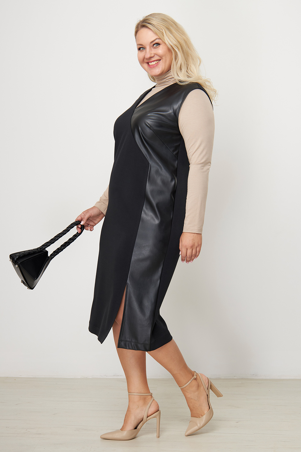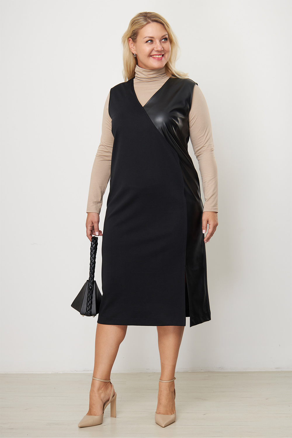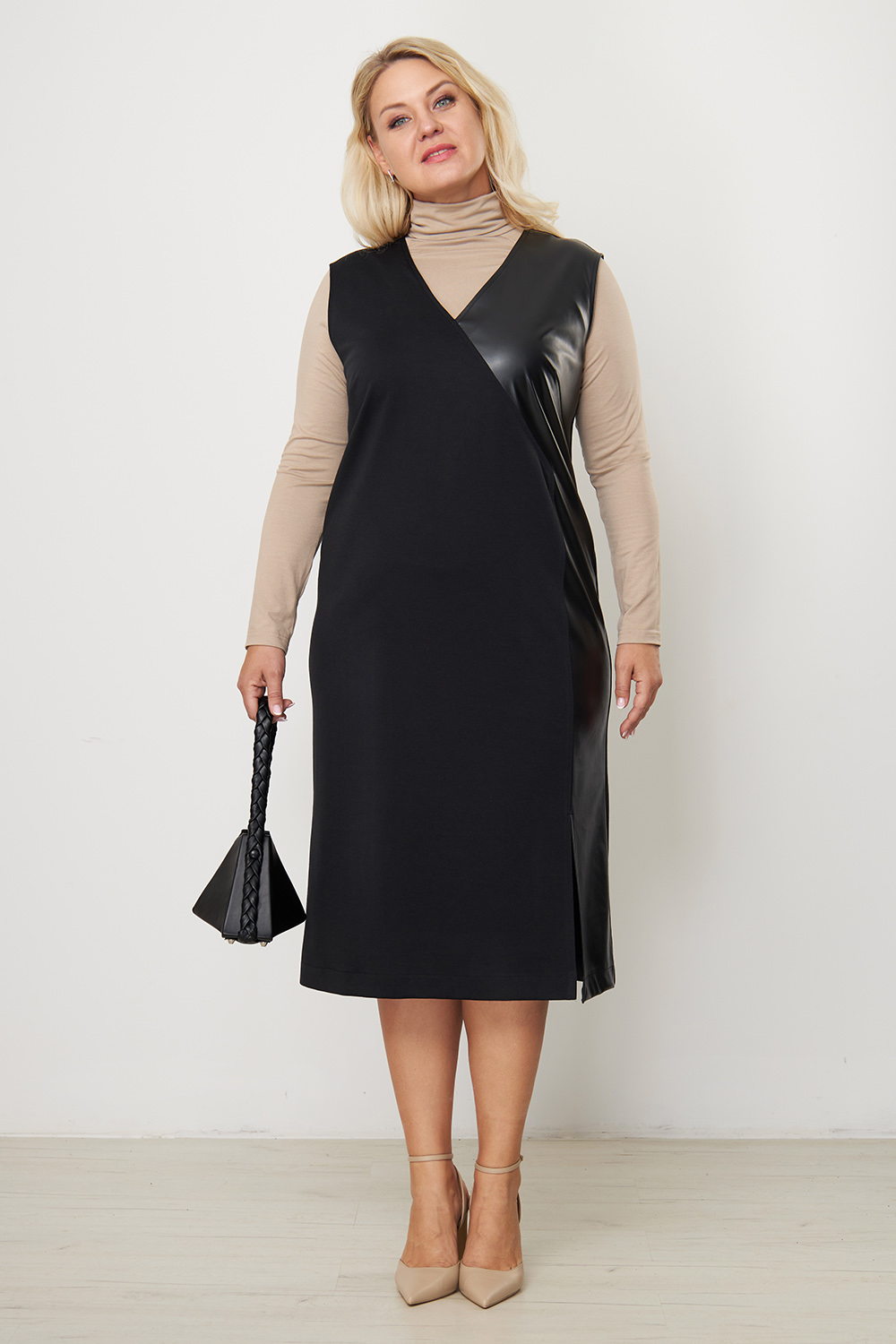 Модель выполнена из плотного трикотажа "джерси" со вставкой из экокожи по боковой части полочки. Обладает прекрасным стройнящим эффектом. Кожаная вставка визуально увеличивает грудь, вытягивает силуэт и усиливает впечатление.