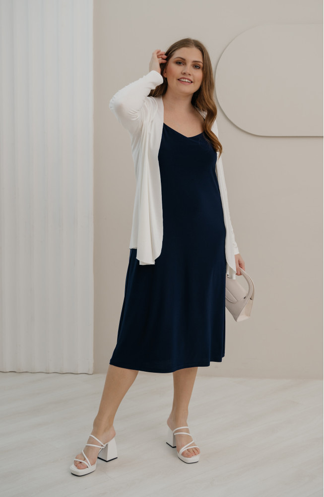 Описание: Сарафан из трикотажа "масло" А-образного силуэта на двойных тонких бретелях с V-образным вырезом декольте и длиной ниже колена.