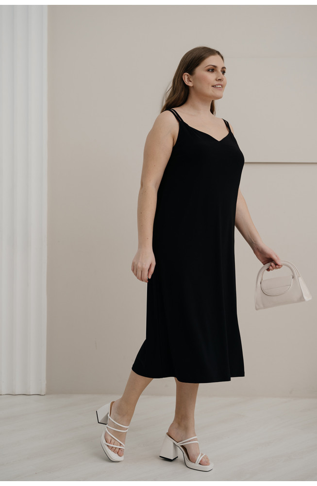 Описание: Сарафан из трикотажа "масло" А-образного силуэта на двойных тонких бретелях с V-образным вырезом декольте и длиной ниже колена.