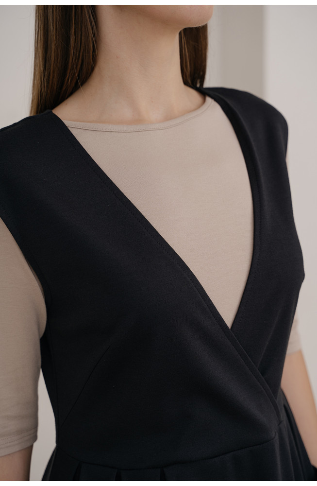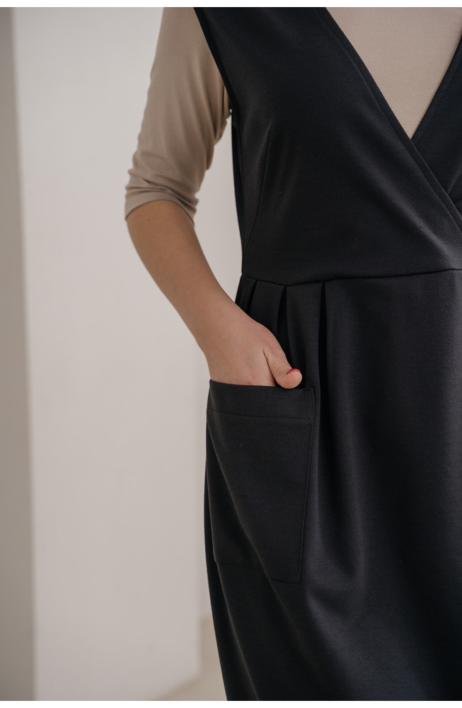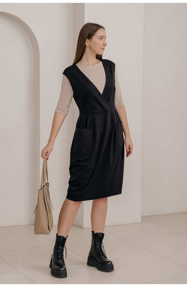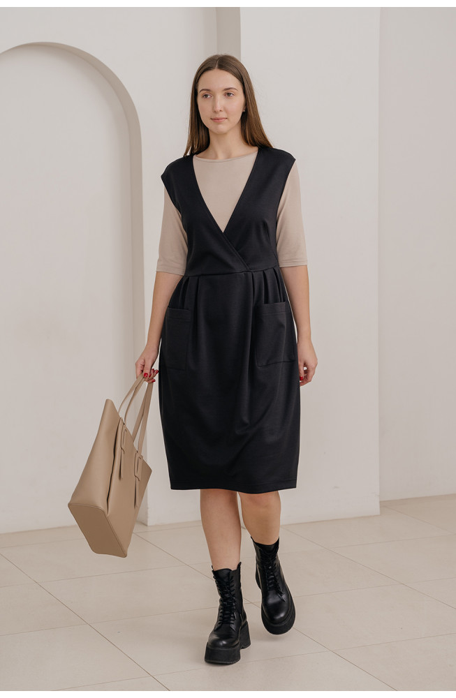 Описание: Сарафан из плотного трикотажа джерси приталенного силуэта отрезной по линии талии с верхней частью на запах с V-образным вырезом горловины и приспущенной линией плеча. Нижняя часть сарафана с небольшими складками от талии и с накладными карманами. Сарафан длиной ниже колена.