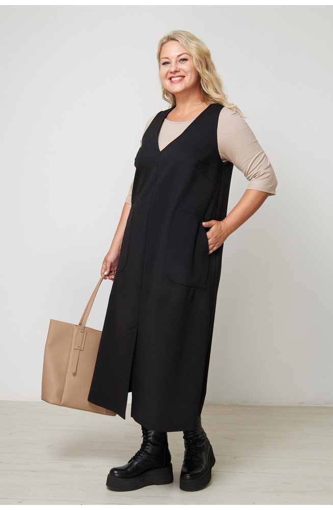 Описание: Сарафан из  плотного  трикотажного полотна, А-силуэта,  V- образным вырезом горловины, накладными карманами, со шлицей по переду.