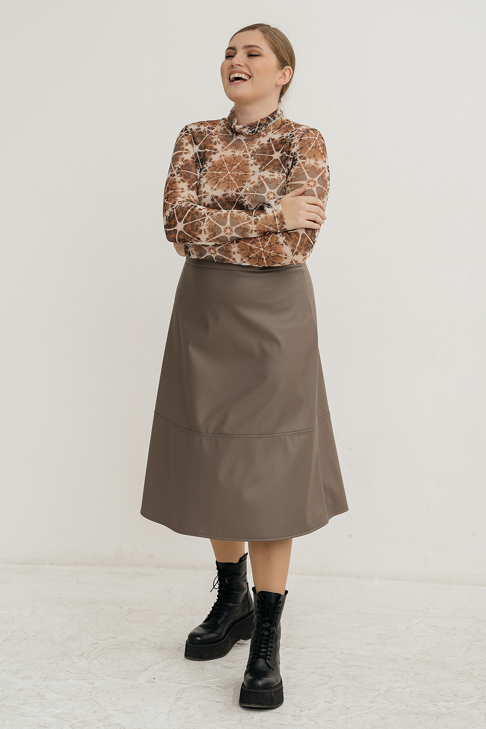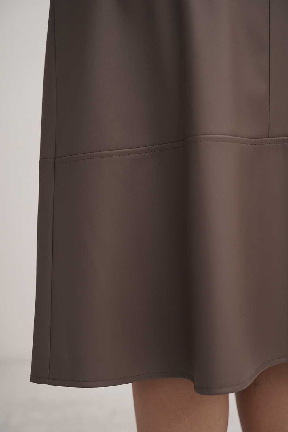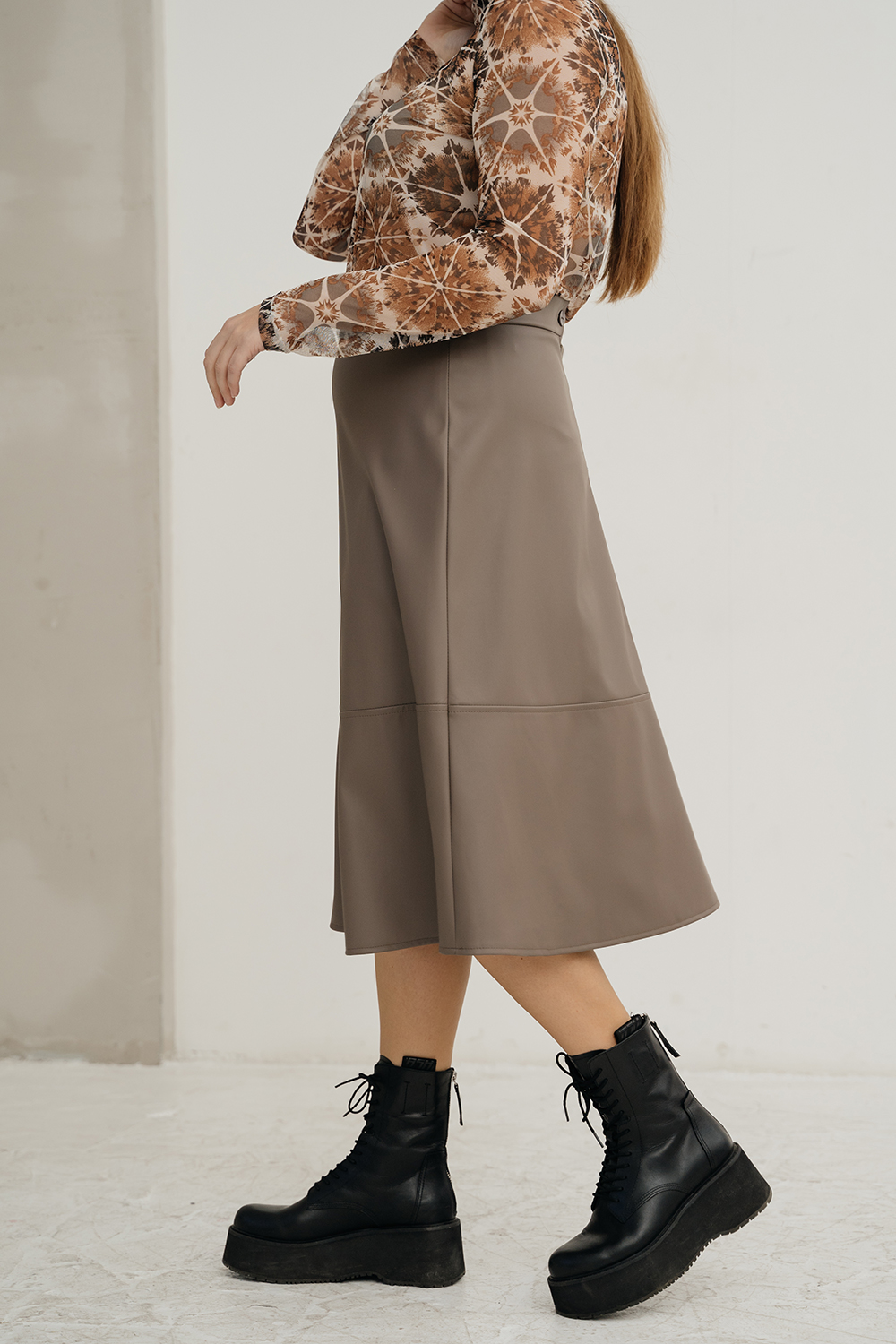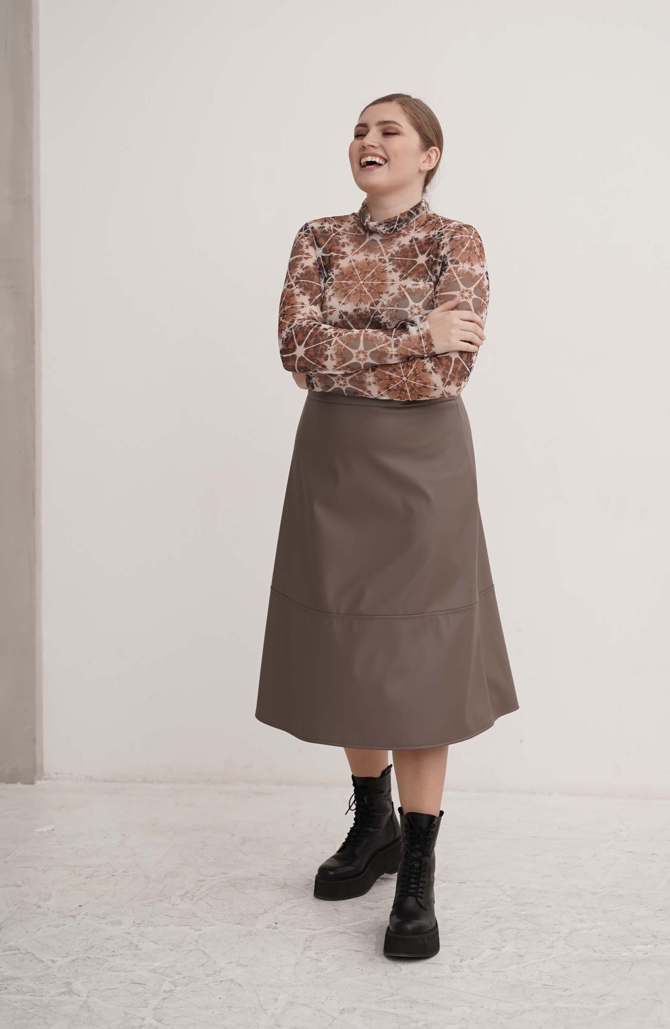 Описание: Юбка женская, юбка из экокожи, без подкладки, юбка миди, расклешеная, от бедра, с поясом на застежке-молнии сзади и с отрезной нижней частью.