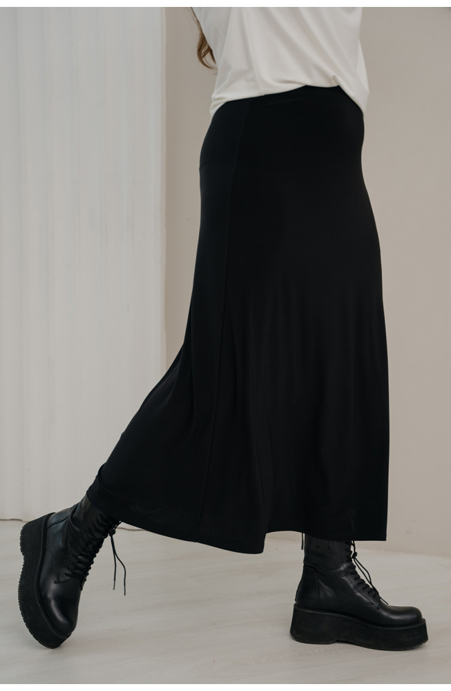 Юбка женская трапеция, длинная, в пол, умеренно расклешенная от бедра, без молнии, с высокой посадкой, на резинке, пришитой к верхнему краю юбки, подвернутой и зафиксированной в нескольких местах на поясе. Летящая юбка макси, однотонная, синяя (или черная) из приятного легкого струящегося трикотажного полотна «масло» или «холодок» прекрасно подойдет для летней погоды. Конструкция изделия обеспечивает комфортную посадку и подойдет ко всем типам фигур, в том числе большим размерам. Это женственная базовая универсальная юбка, которая позволит составить интересные образы для жизни в городе, для работы в офисе, для прогулок, для отдыха, в том числе на море в сочетании с блузками, топами, маечками и кардиганами.