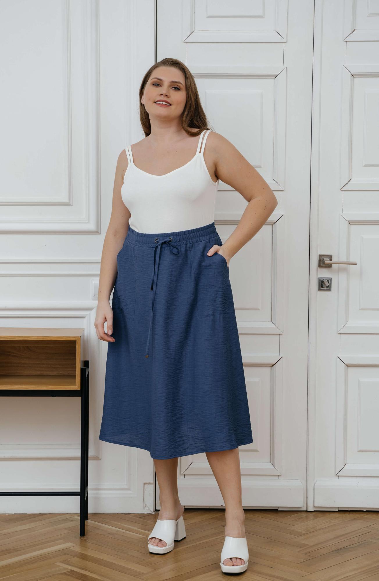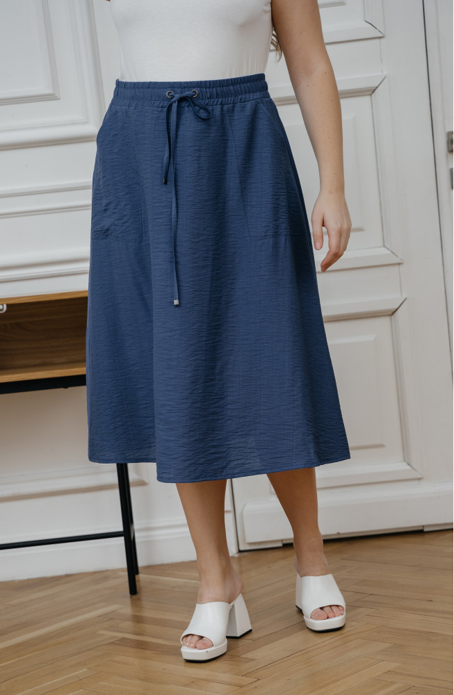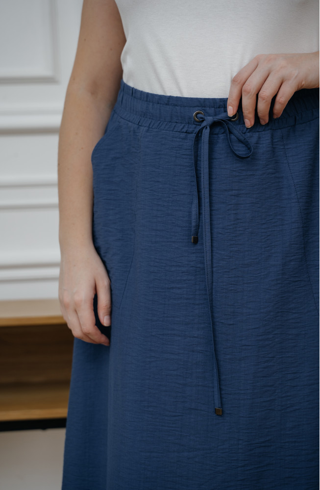 Описание: Юбка-клёш из вискозной ткани с жатым эффектом на поясе с резинкой и завязками по талии и с обьемными карманами. Юбка длиной до середины голени.