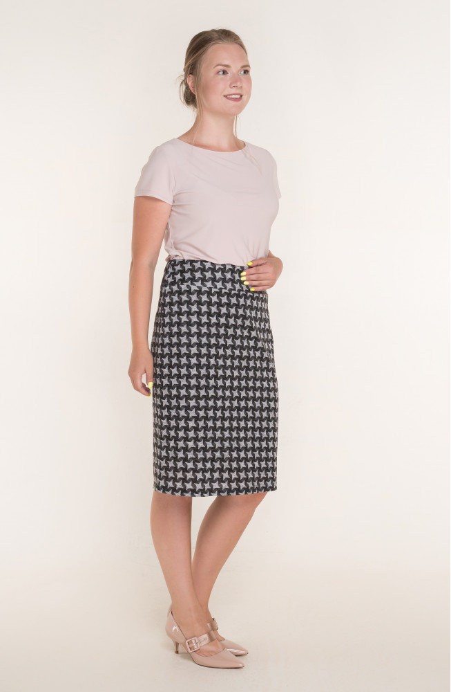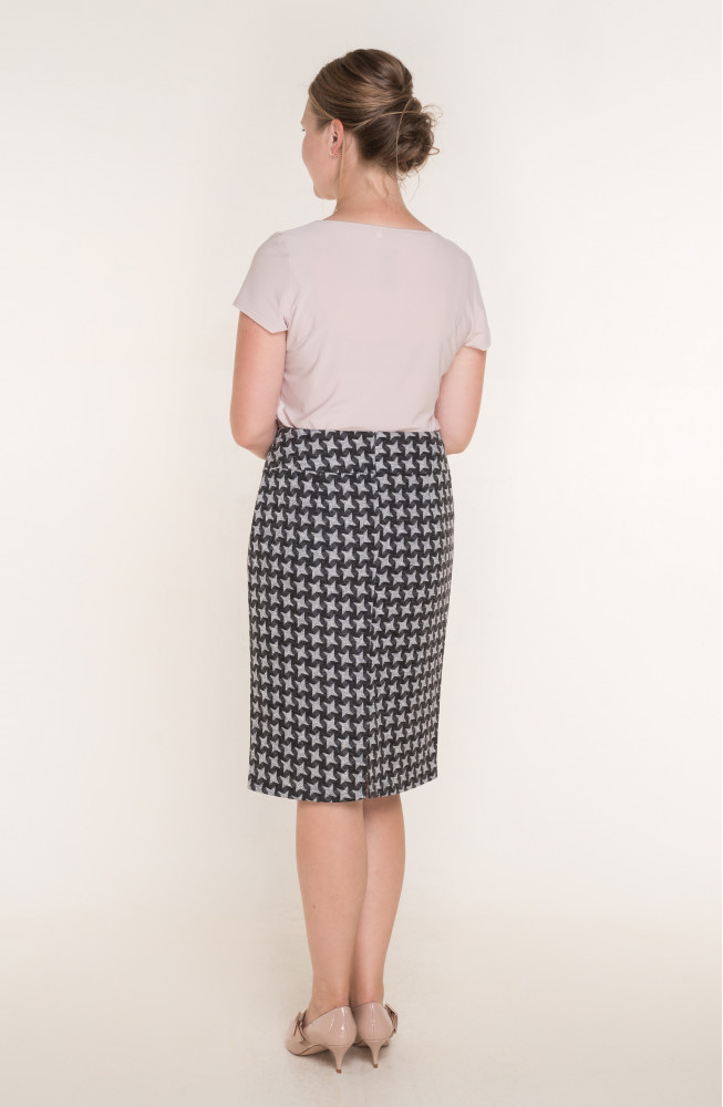 Описание: Юбка-карандаш из плотного трикотажа на поясе-кокетке с застежкой-молнией сзади длиной за колено на подкладке.