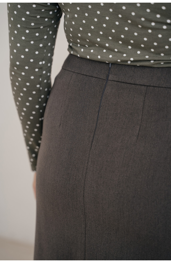 Описание: Юбка-карандаш из костюмной ткани на поясе с застежкой-молнией сбоку и с высоким разрезом спереди. Юбка длиной ниже колена.