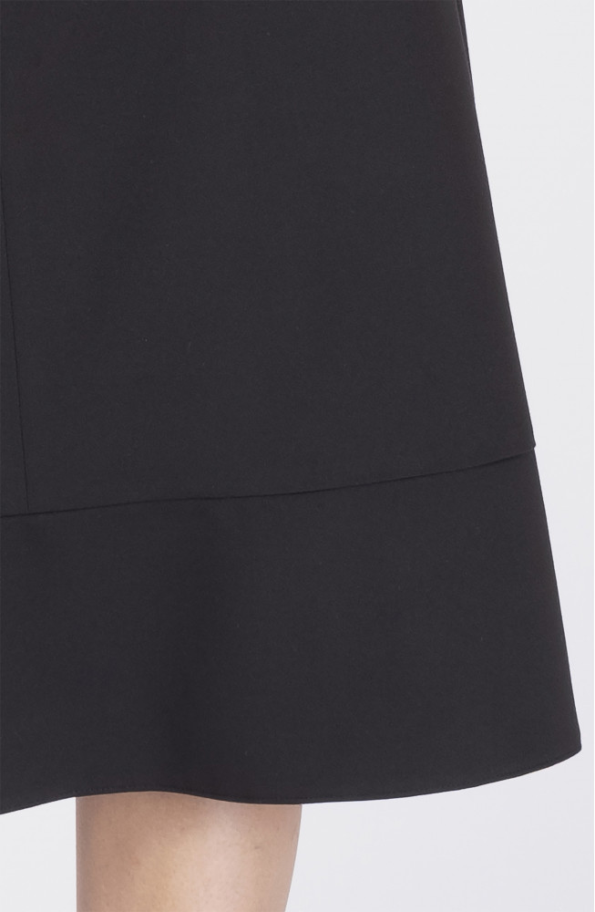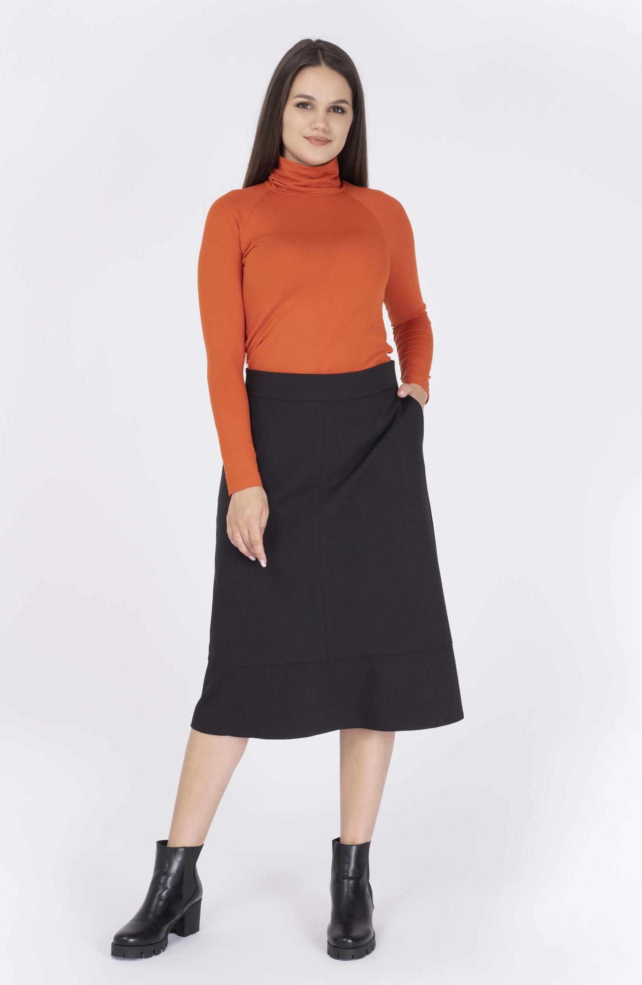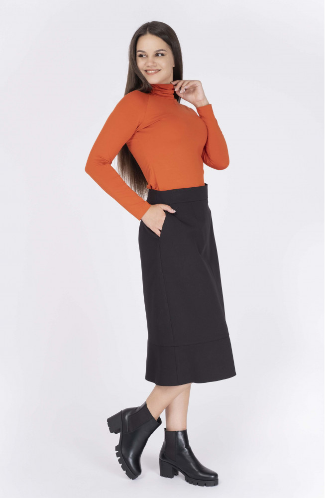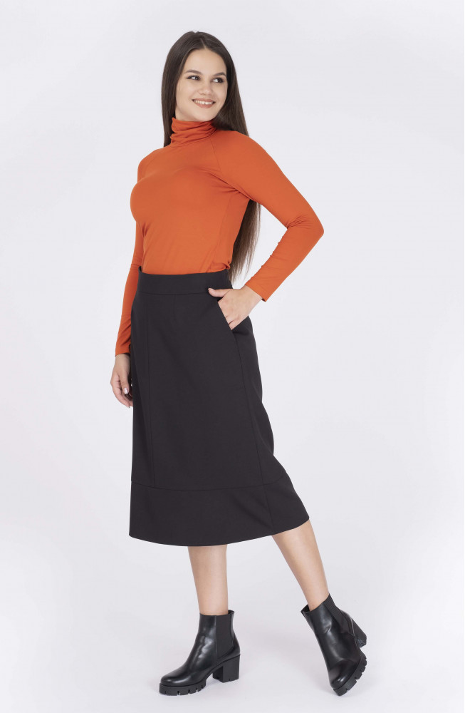 Описание: Юбка из костюмной ткани с небольшим клешением на поясе по талии с молнией сзади, карманами в боковых частях и широкой планкой по низу.