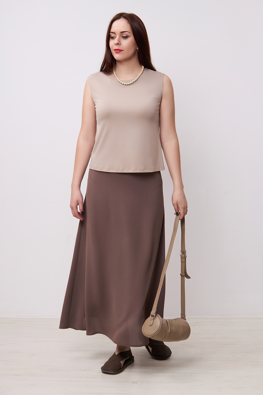Летящая юбка макси выполнена из костюмной ткани с жатым эффектом, что придаёт ей особый шарм, делая образ легким. Она не мнется, что очень удобно для путешествий, поездок к морю и активного отдыха.