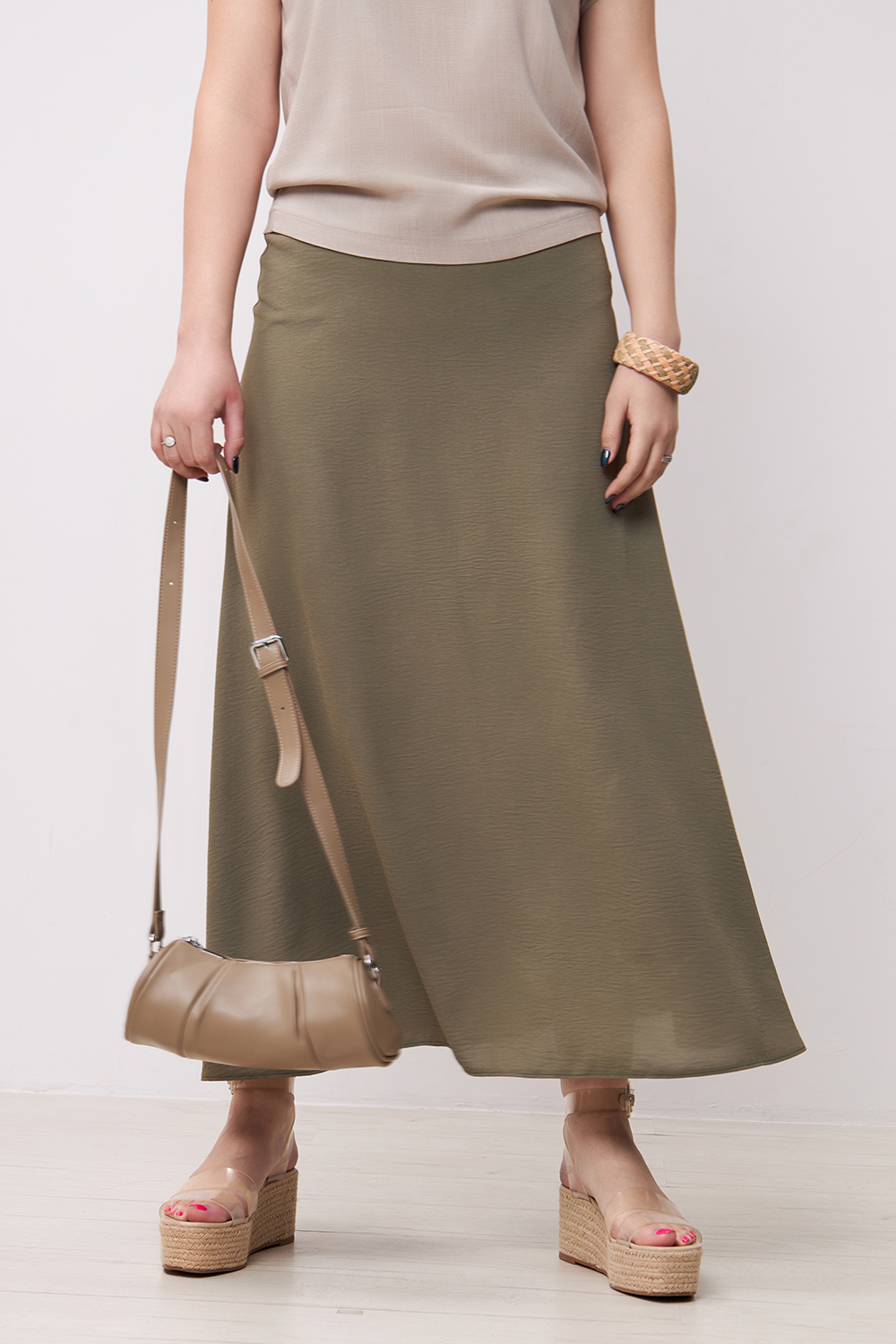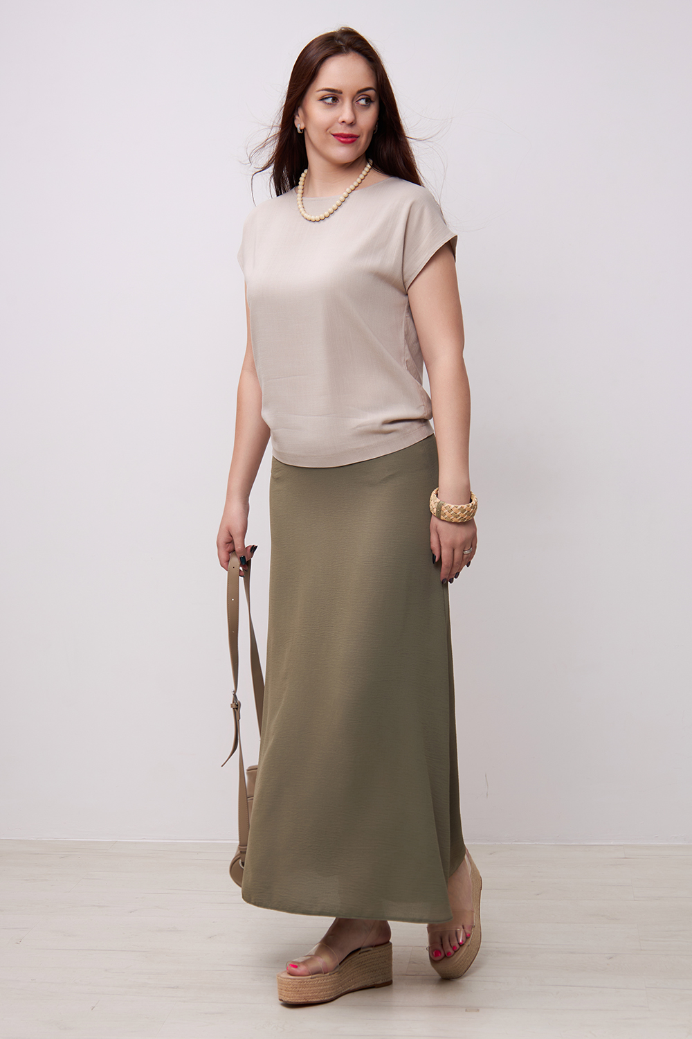 Летящая юбка макси выполнена из костюмной ткани с жатым эффектом, что придаёт ей особый шарм, делая образ легким. Она не мнется, что очень удобно для путешествий, поездок к морю и активного отдыха.