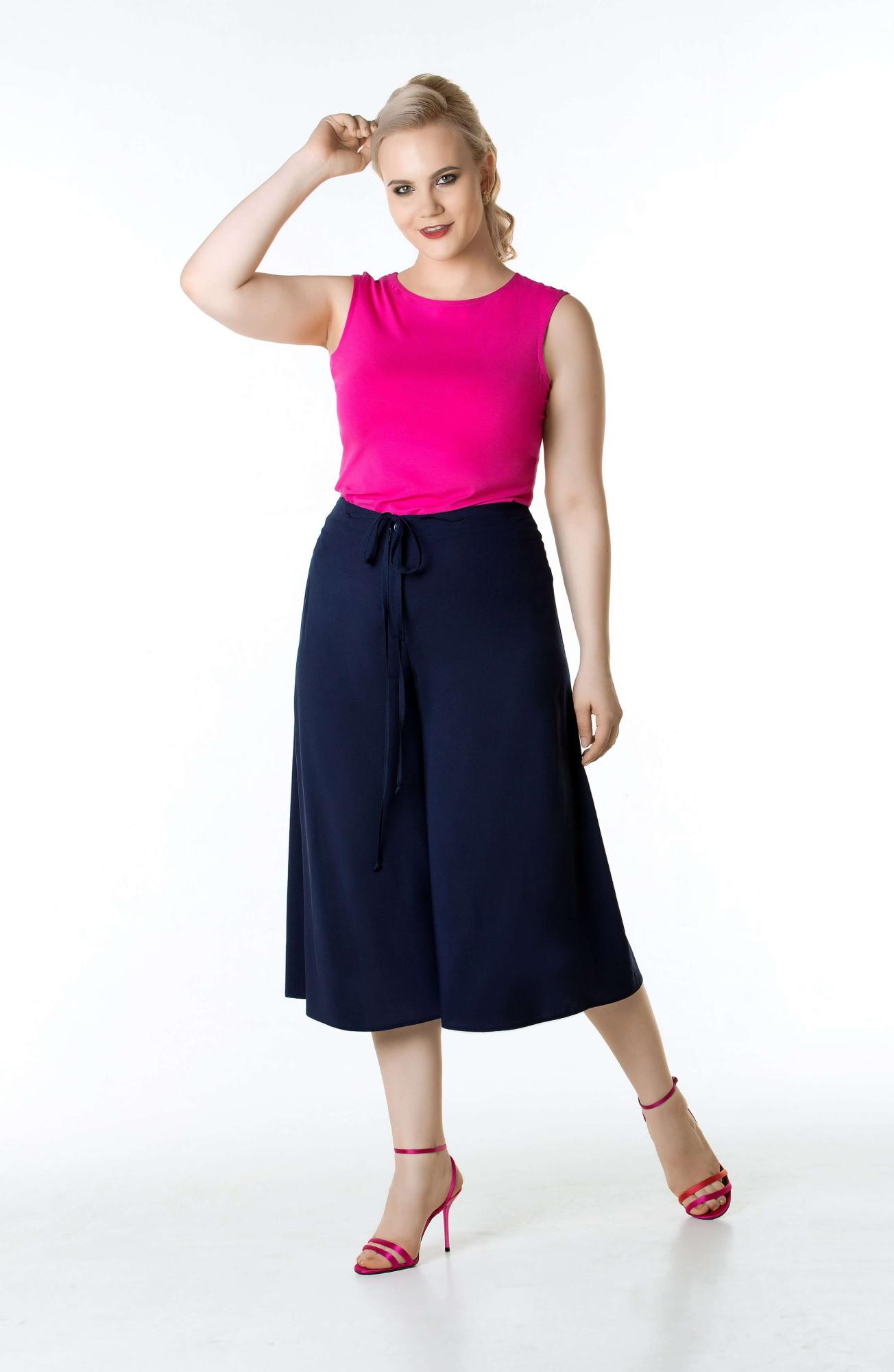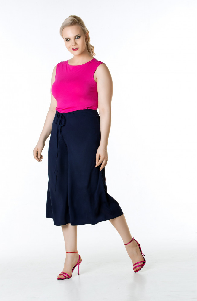 Описание: Брюки-кюлоты из вискозной ткани на застежке-молнии с завязкой-шнурком по талии.