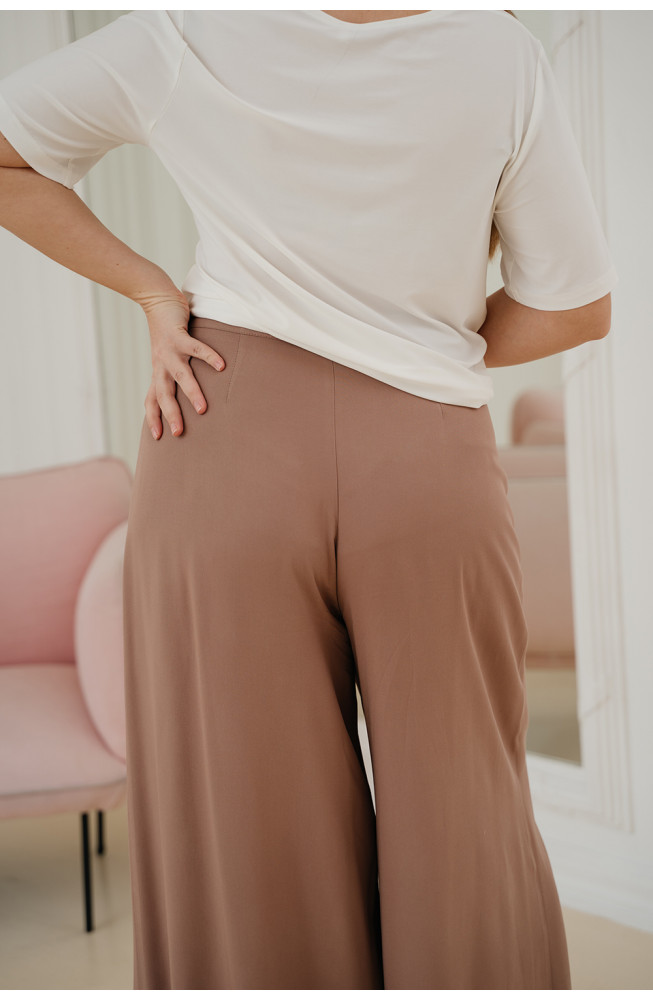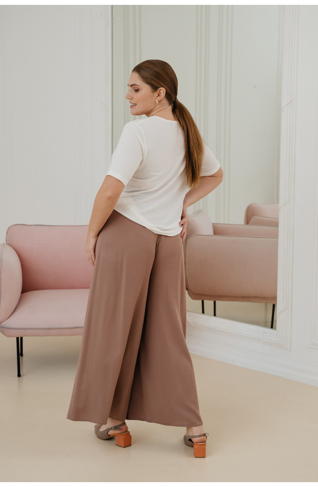 Описание: Легкие женские брюки незаменимы жарким летом; натуральная по составу, гладкая фактура полотна исключает трение ног между собой, в жару, это спасает женщин с пышными бедрами от необходимости носить летом длинные панталоны. Широкие брюки больших и маленьких размеров, с высокой посадкой, расклешенные от бедра, повседневные, длинные, из вискозного штапеля, на застежке-молнии спереди, с завязкой-шнурком по талии. Брюки типа палаццо - невесомые, нежные, будут особенно удобны на отдыхе, а также в городе, на прогулке, в путешествии. Завязка позволяет регулировать размер изделия по талии. По силуэту летние брюки в базовом цвете, хорошо сочетаются с блузками, рубашками, топами, майками и короткими кардиганами.