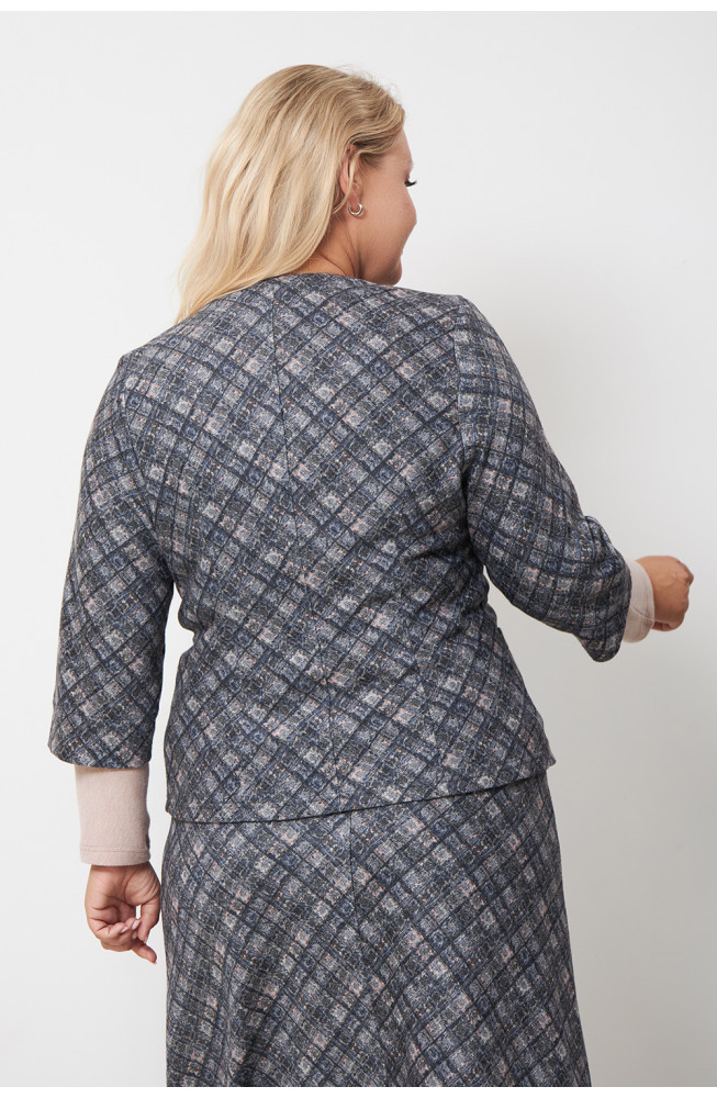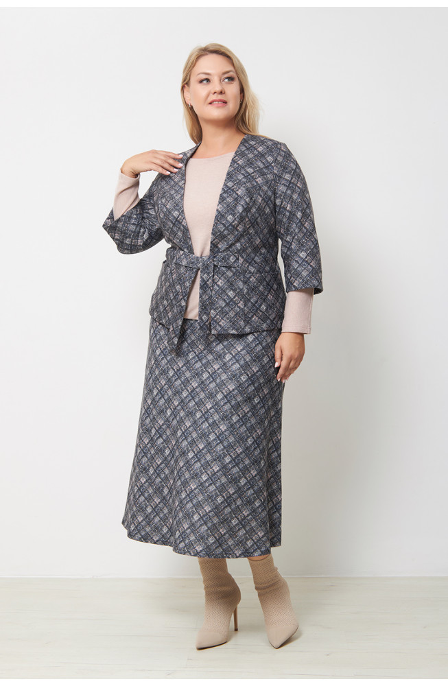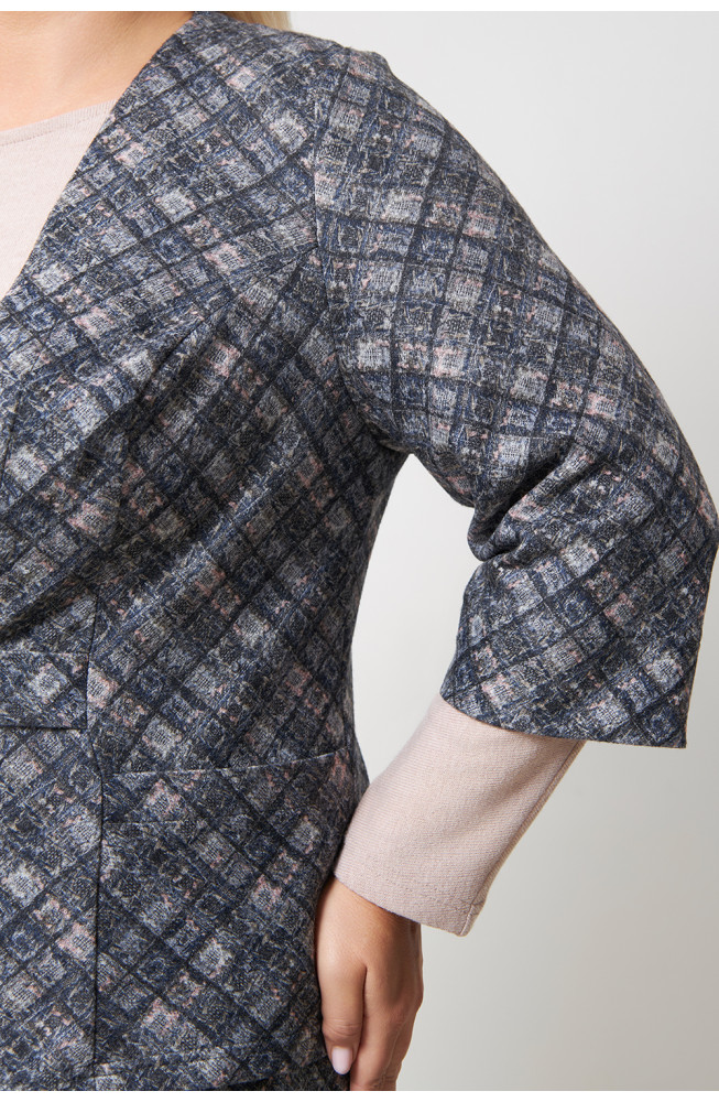 Описание: Жакет женский трикотажный полуприлегающего силуэта с V-образным вырезом горловины, карманами в боковых частях и на завязках по талии. Рукава расширенные 3/4.