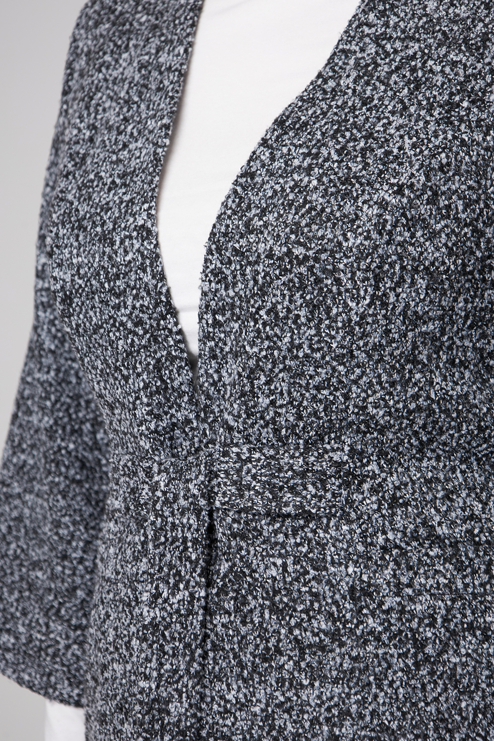 Описание: Жакет из из фактурного трикотажа "букле" полуприлегающего силуэта с V-образным вырезом горловины, карманами в боковых частях и на завязках по талии. Рукава расширенные 3/4.