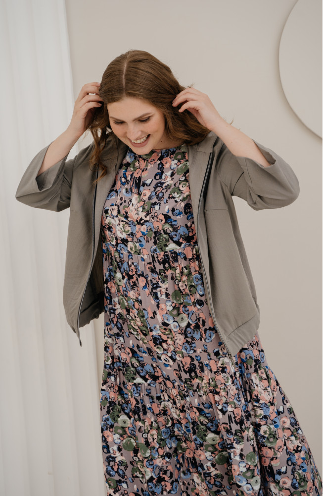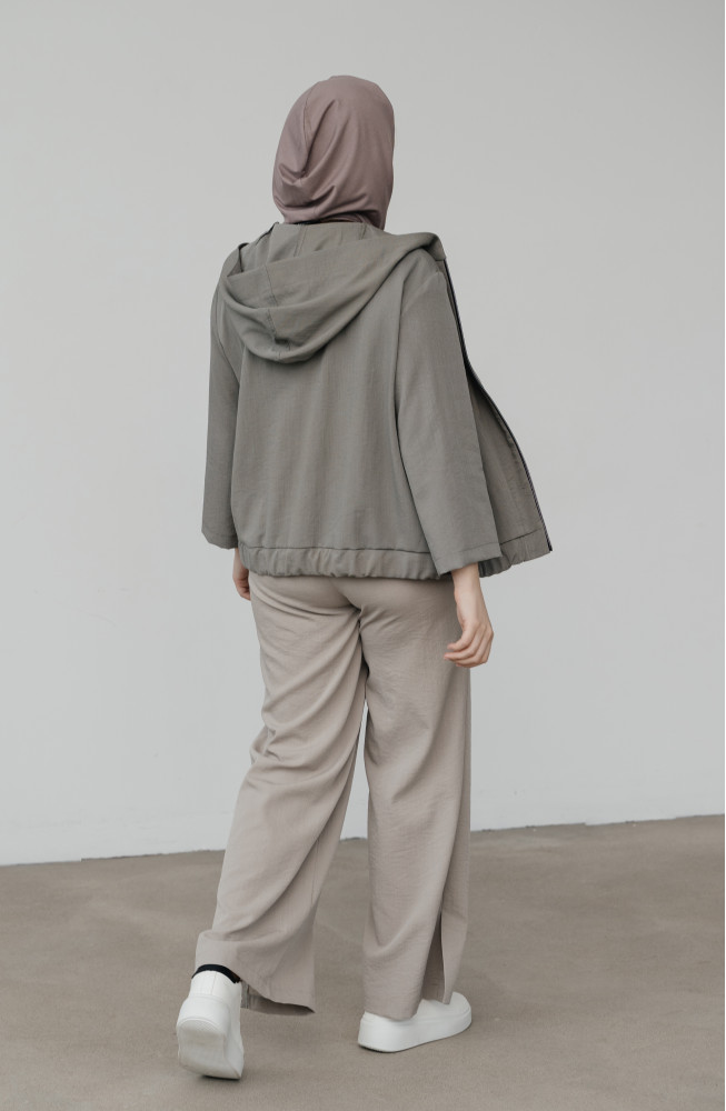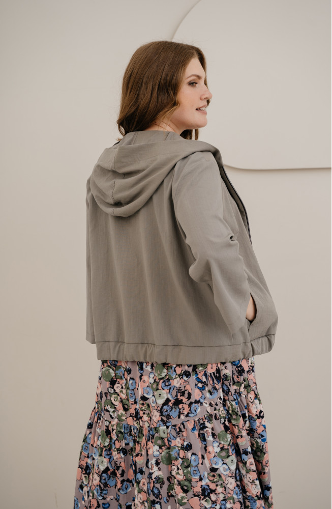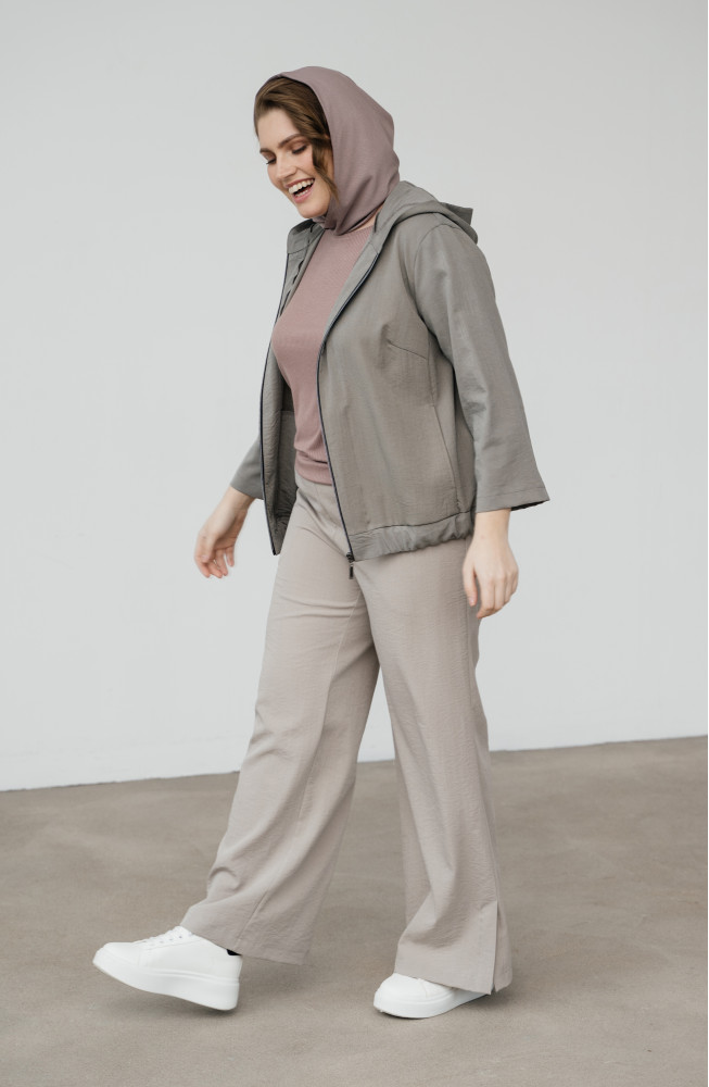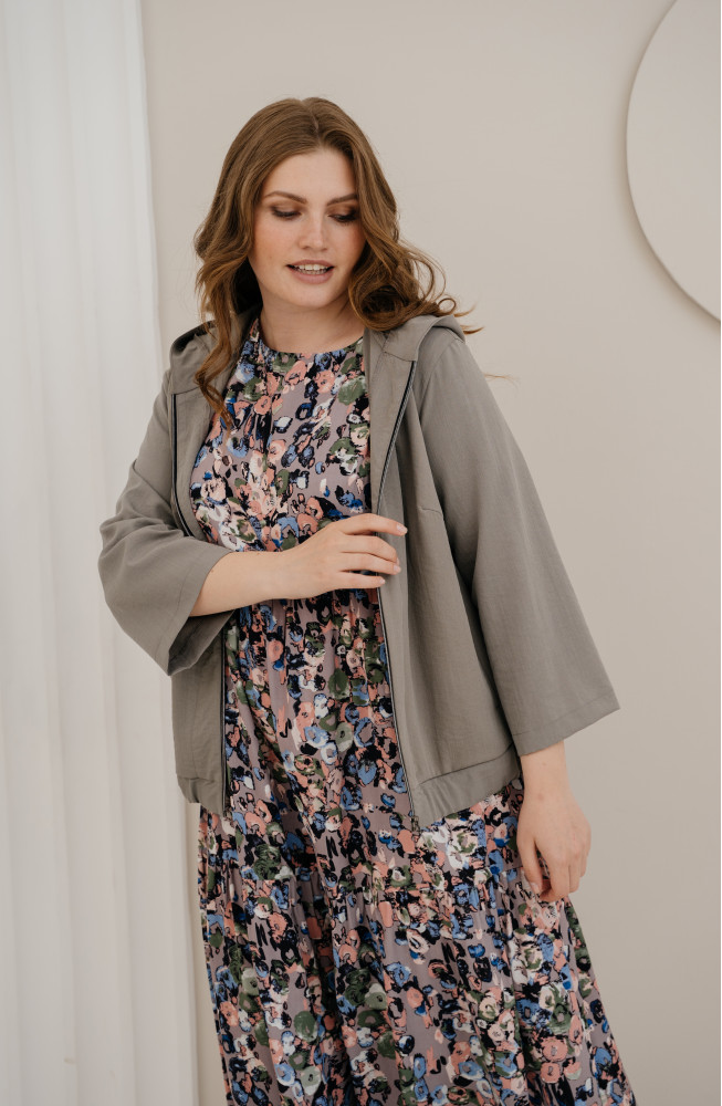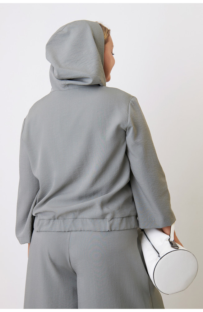 Описание: Жакет из плотной костюмной ткани с жатым эффектом прямого силуэта на молнии с капюшоном и широкими рукавами длиной 7/8.