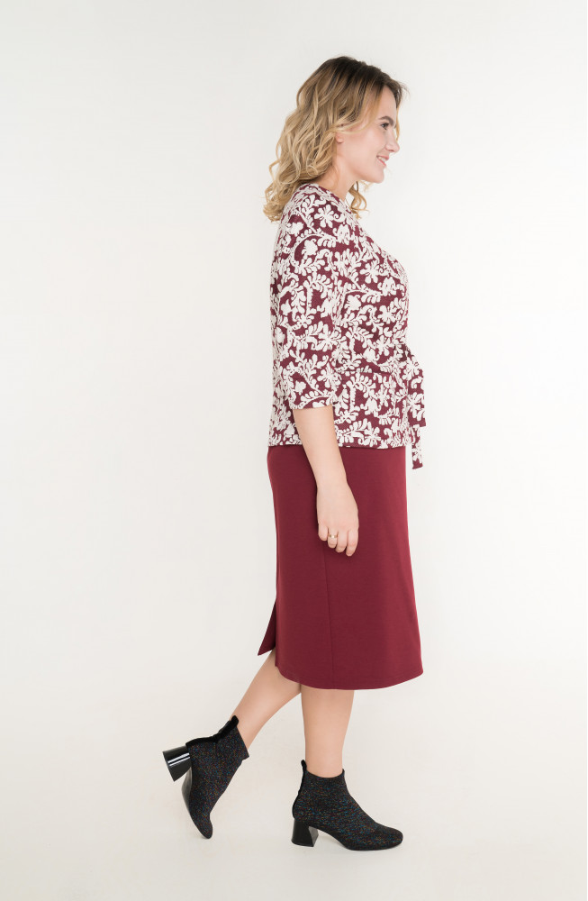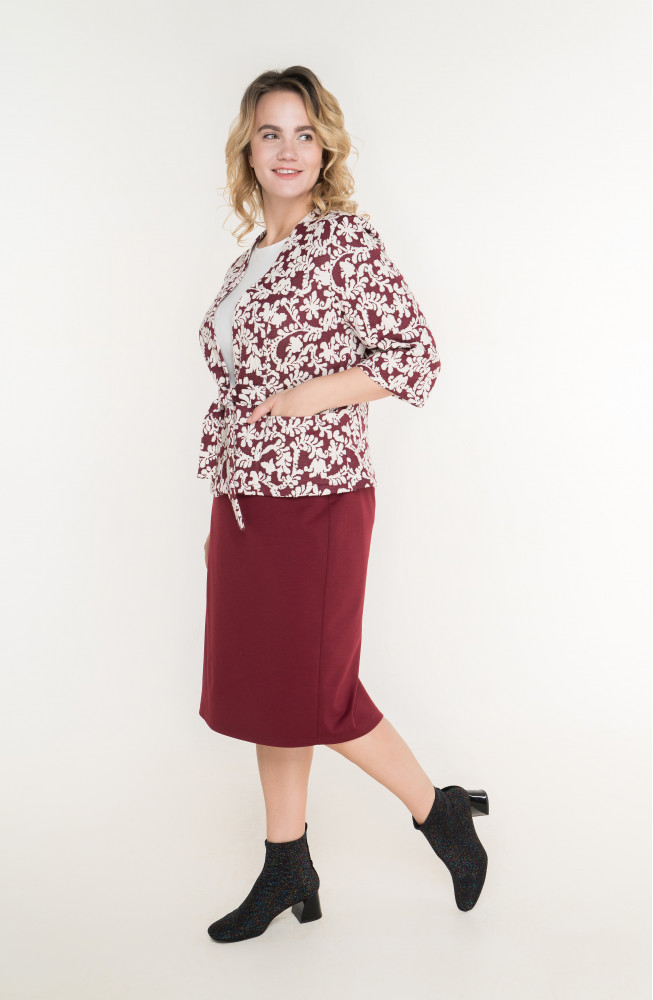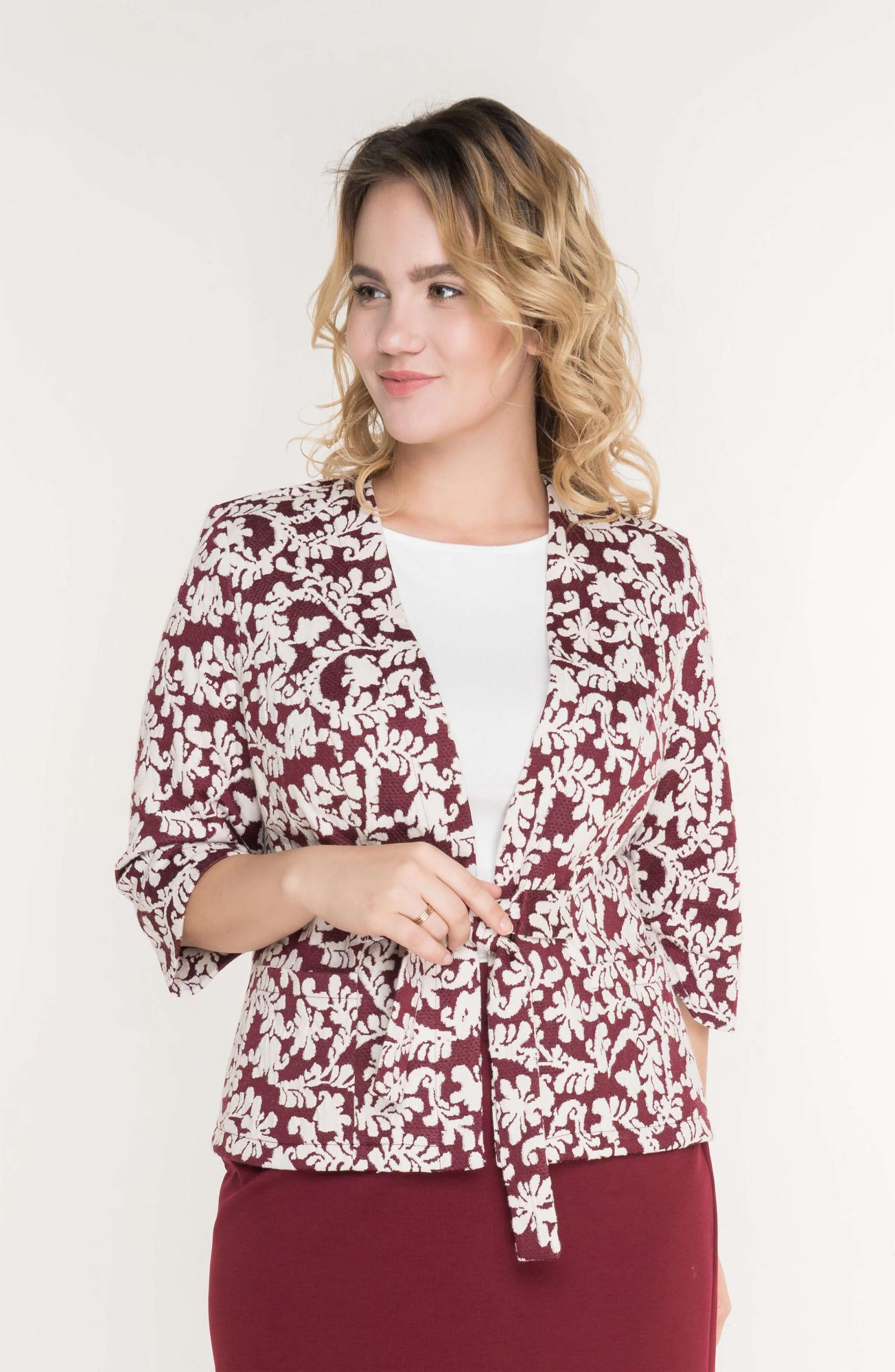 Описание: Жакет из жаккардового трикотажа полуприлегающего силуэта с V-образным вырезом горловины, карманами в боковых частях и на широких завязках спереди. Рукава расширеные 3/4.