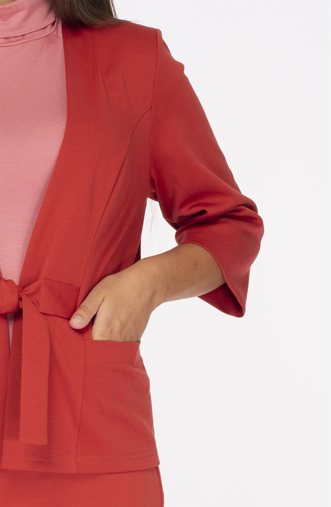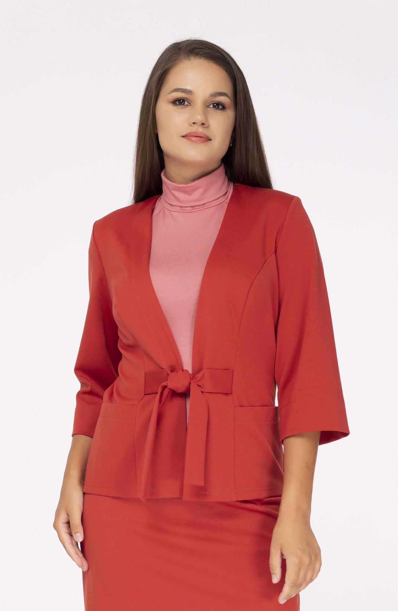 Описание: Жакет полуприлегающего силуэта с коротким полурукавом. На полочке две нагрудные вытачки и застежка на пуговицы. Горловина круглая. Длина до середины бедра.