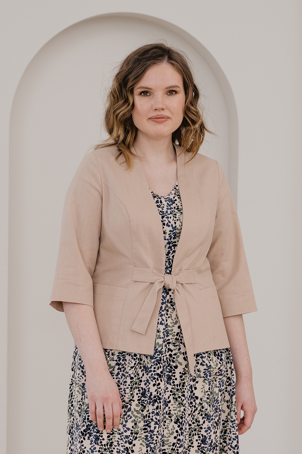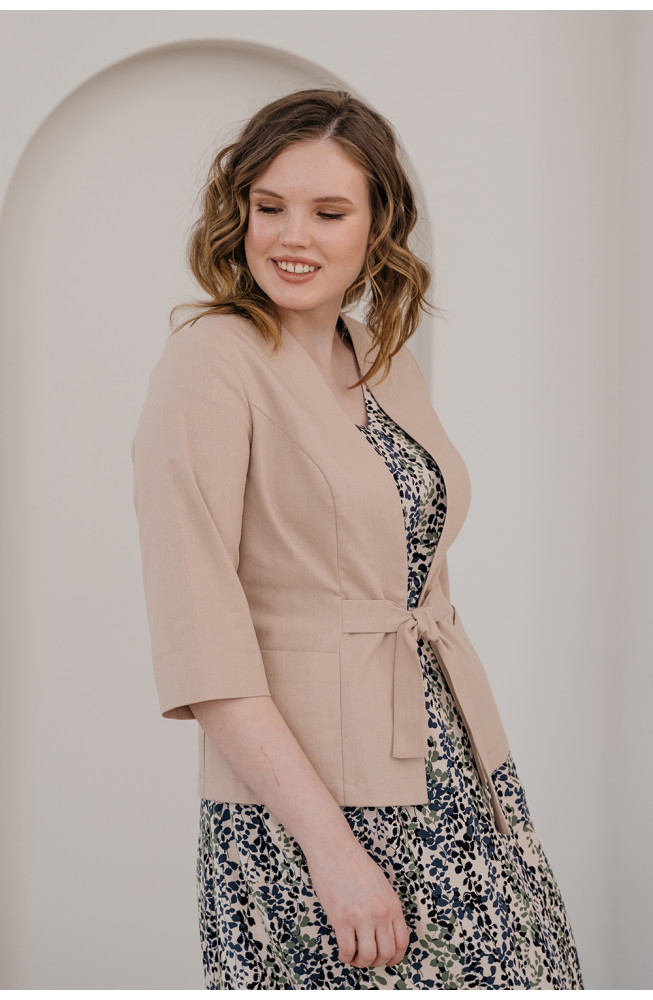 Описание: Жакет из льняной ткани полуприлегающего силуэта с V-образным вырезом горловины, карманами в боковых частях и на завязках по талии. Рукава расширеные 3/4.