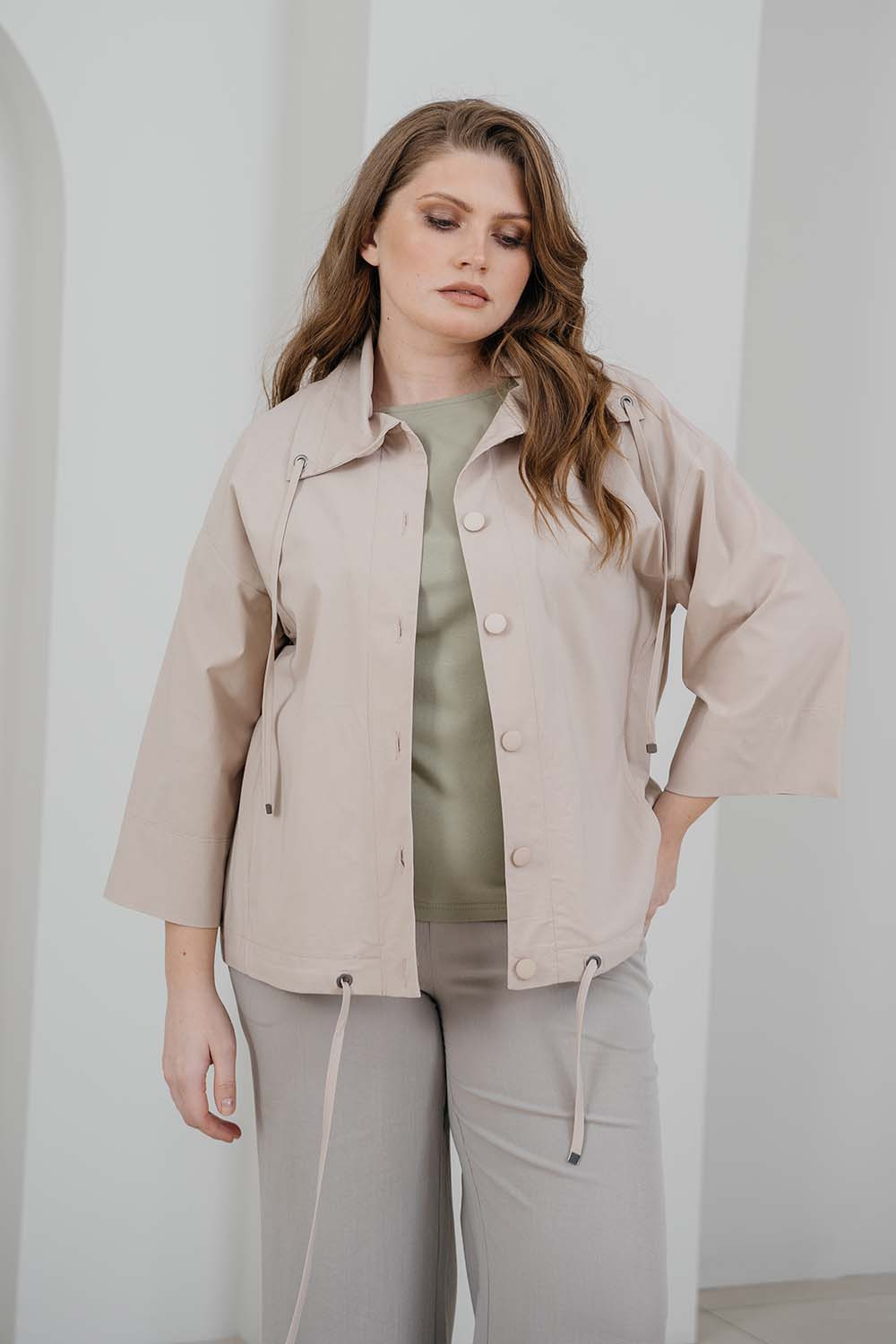 Описание: Жакет из хлопковой ткани-стрейч "бенгалин" силуэта oversize на застежке на пуговицы с воротником с кулисой со шнурком, с кулисой по низу, широкими рукавами длиной 7/8 на спущенном плече и с карманами в рельефных швах.
