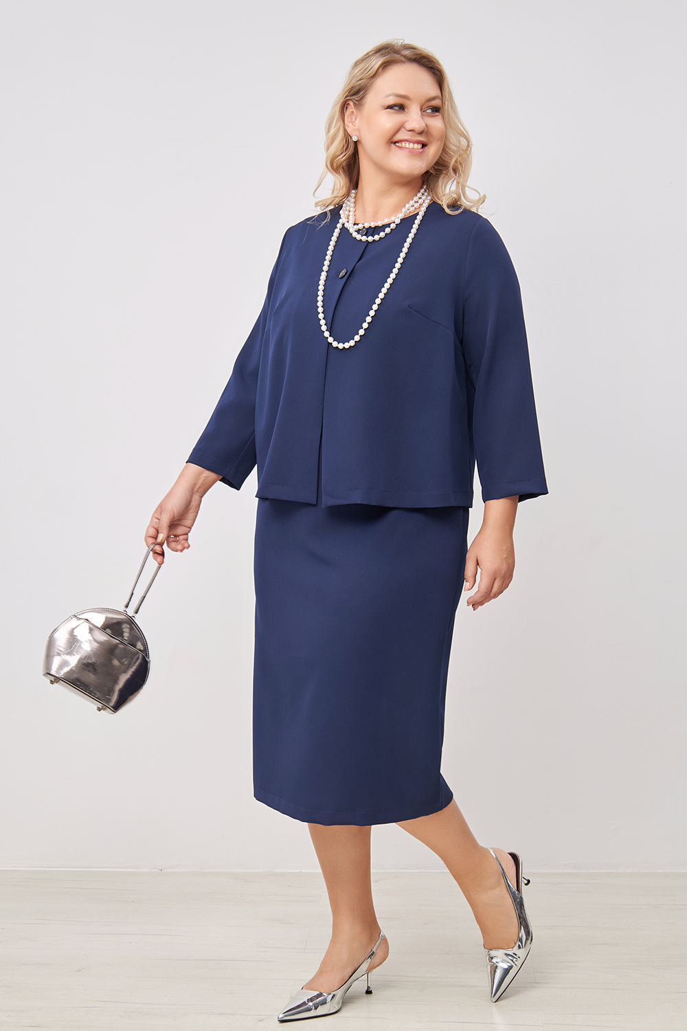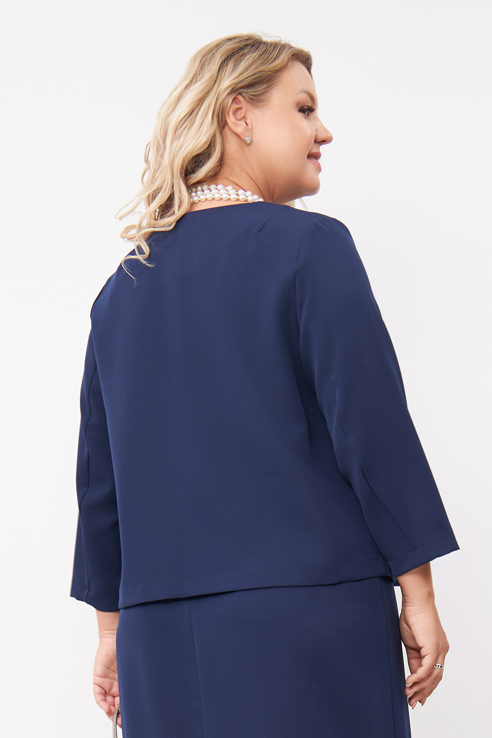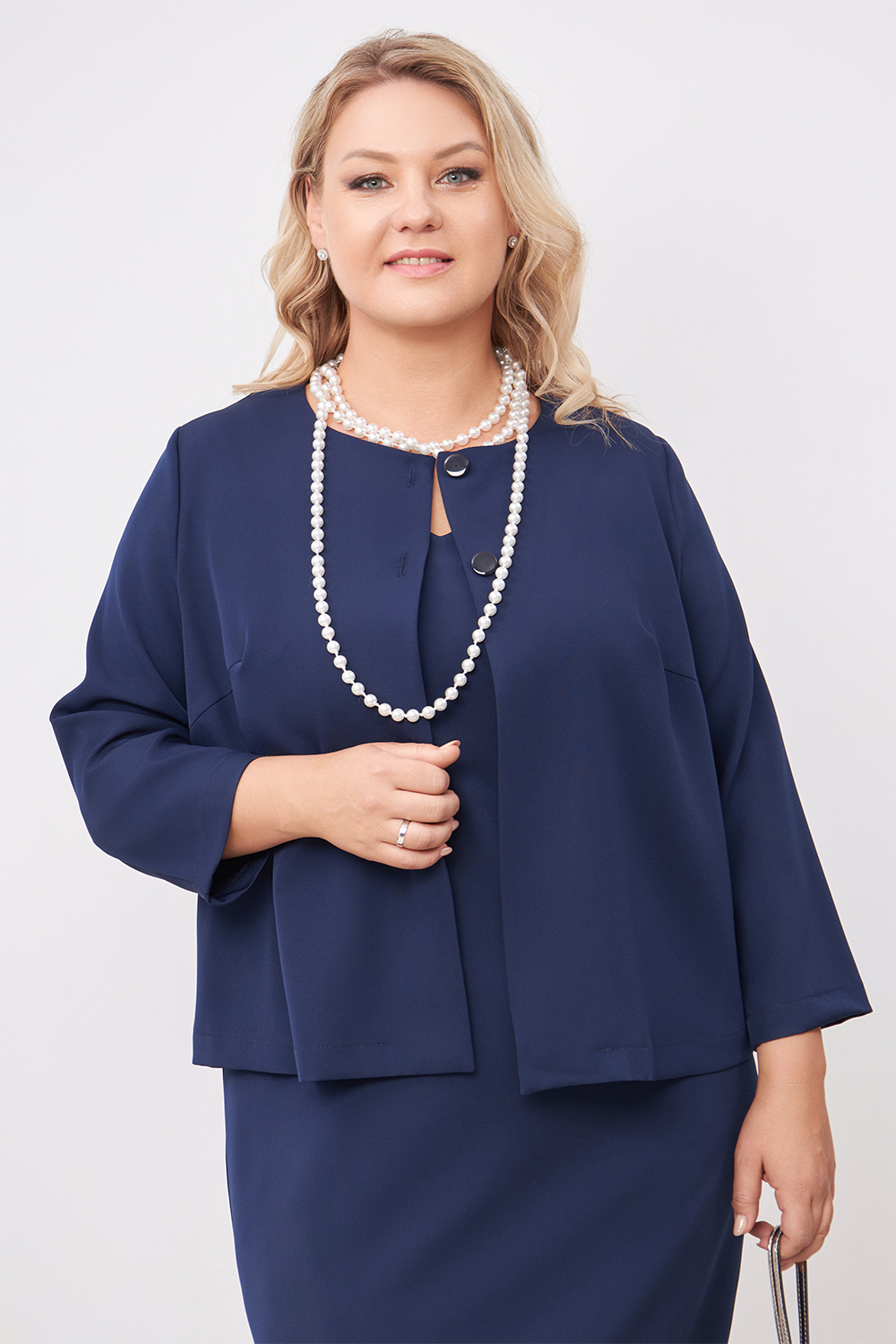 Жакет п/п силуэта, не много расширен к низу, юбочной длины, на 2х пуговицах с двушовными рукавами, длинной 3/4