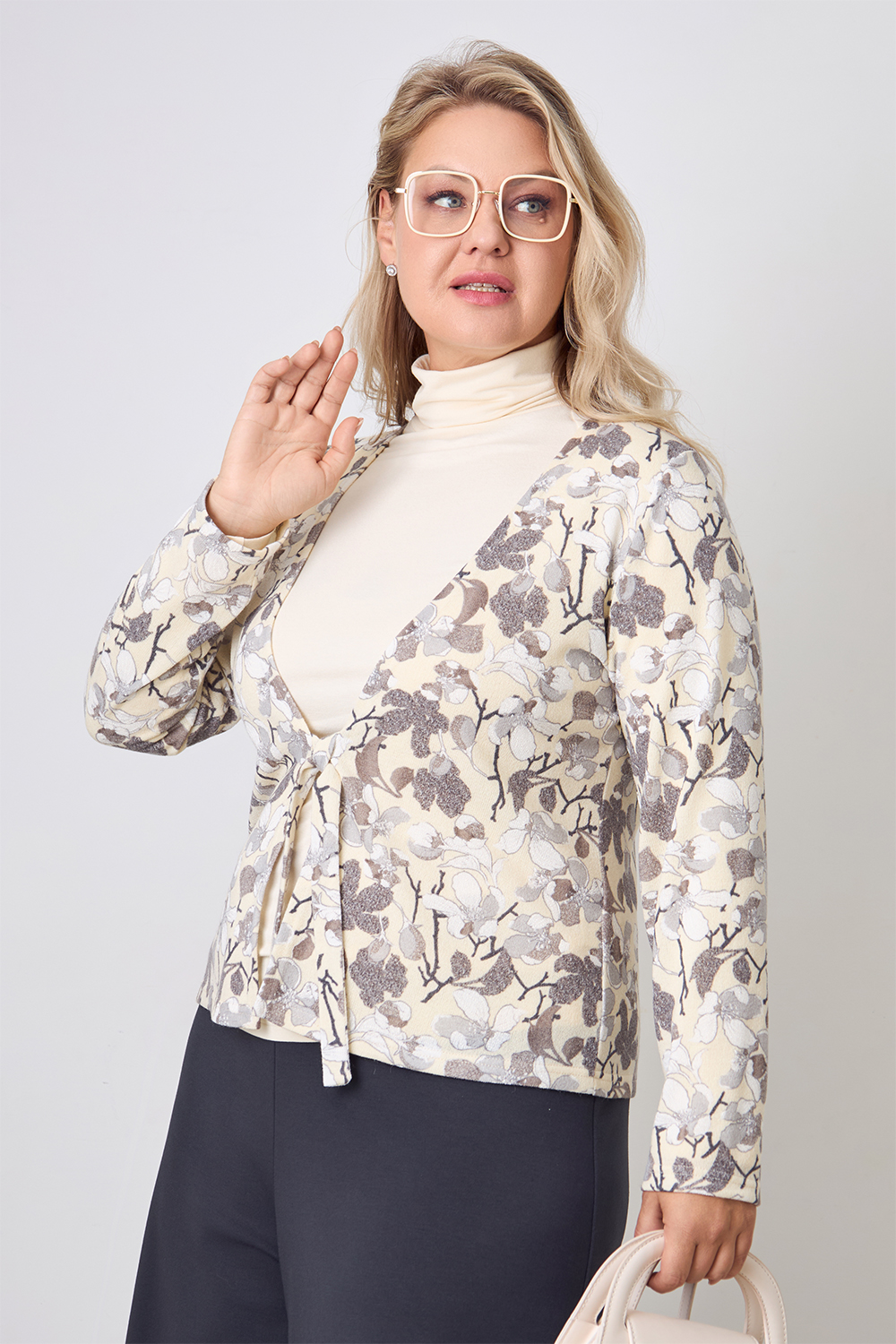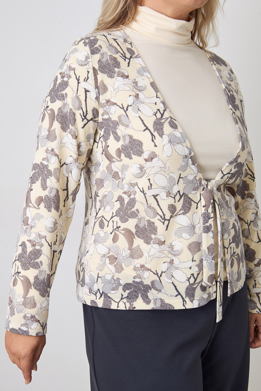 Описание: Жакет из мягкого трикотажа "ангора" полуприлегающего силуэта с V-образным вырезом горловины на завязках спереди. Рукава длинные.