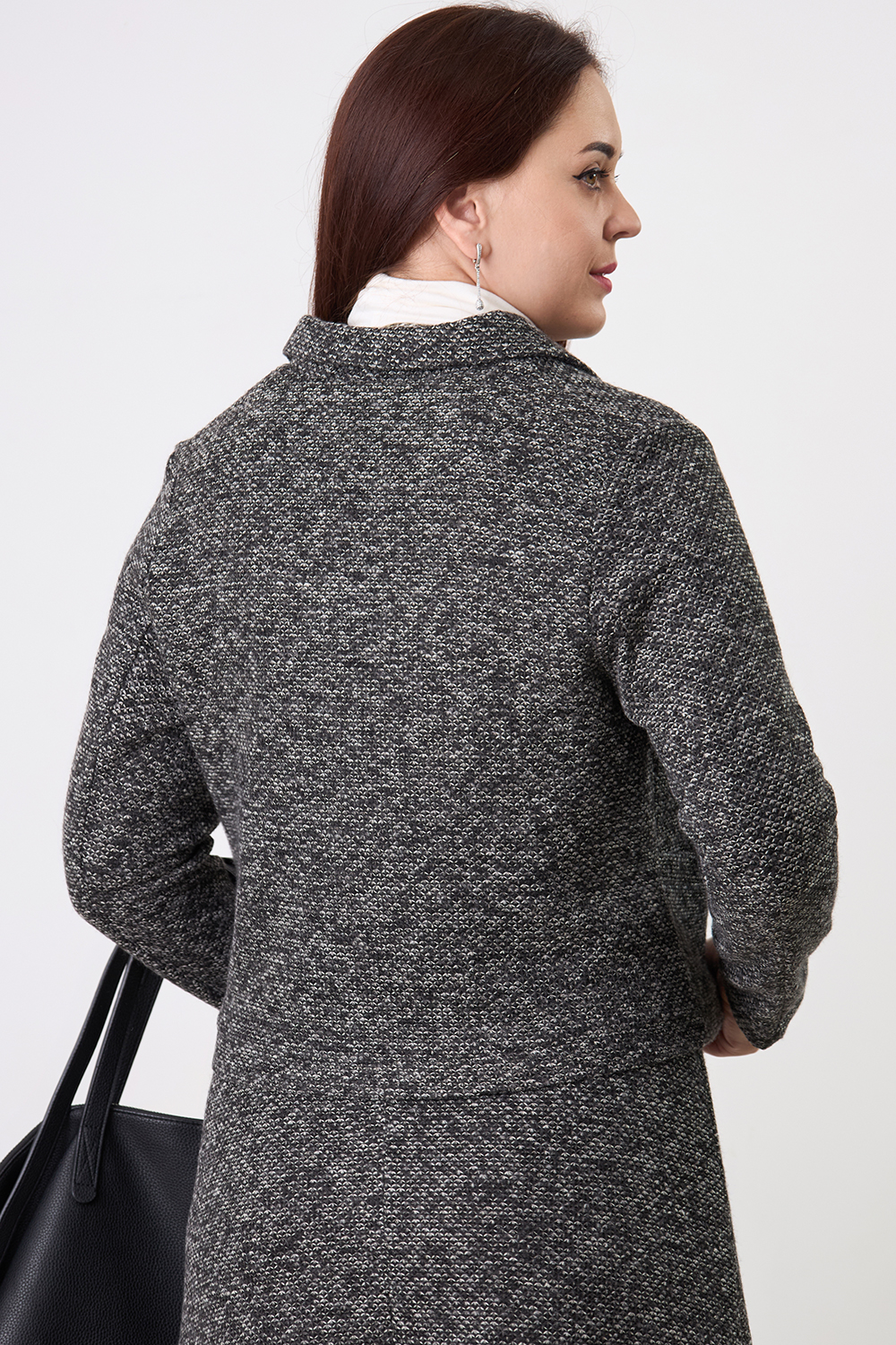 Укороченный жакет прямого силуэта на молнии. Модель слегка расклешенная к низу, имеет стояче-отложной воротник, накладные карманы и длинные двушовные рукава.