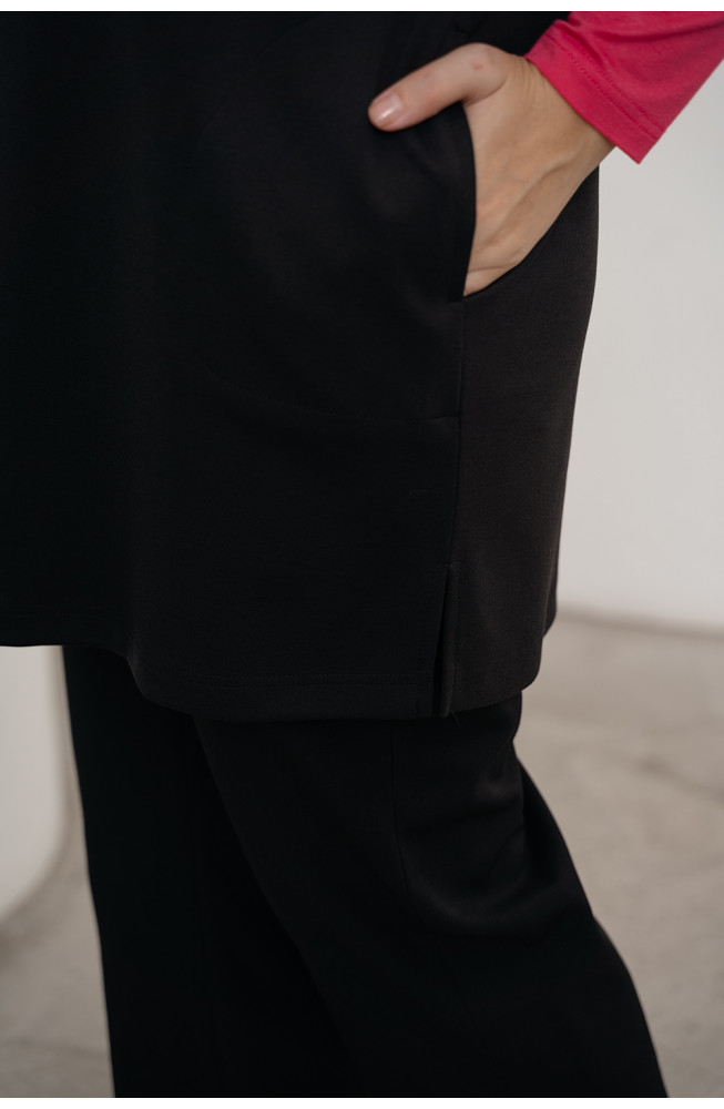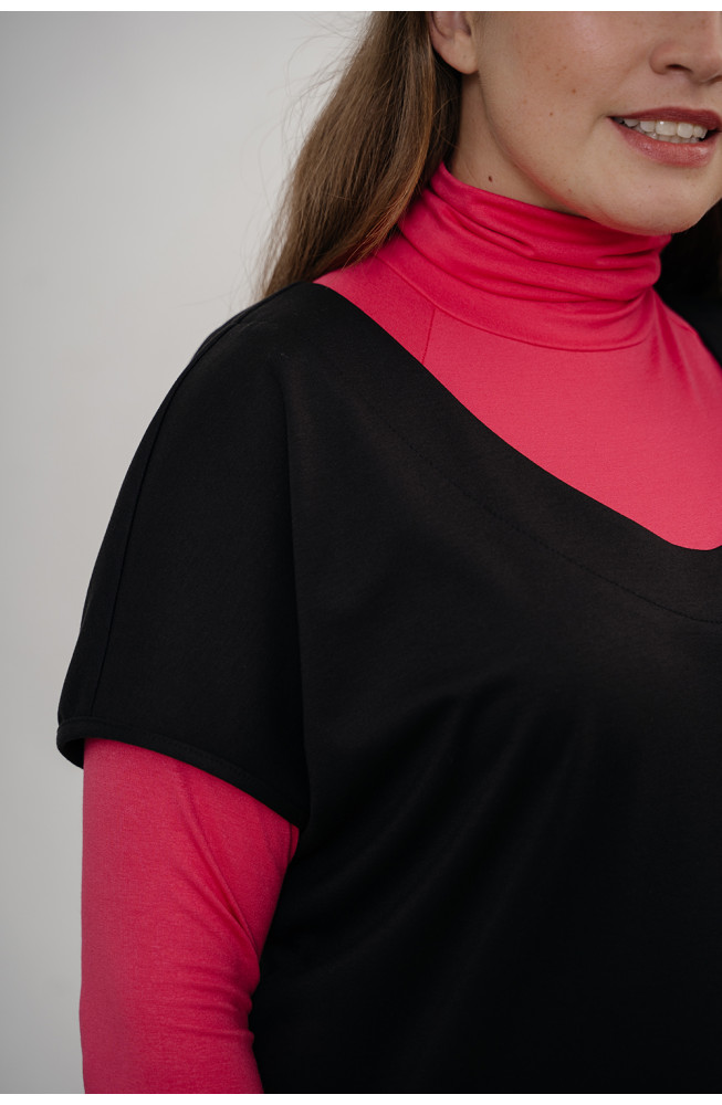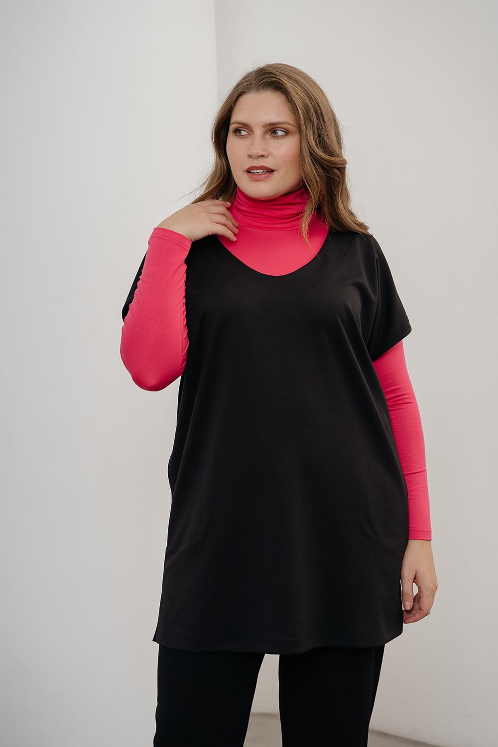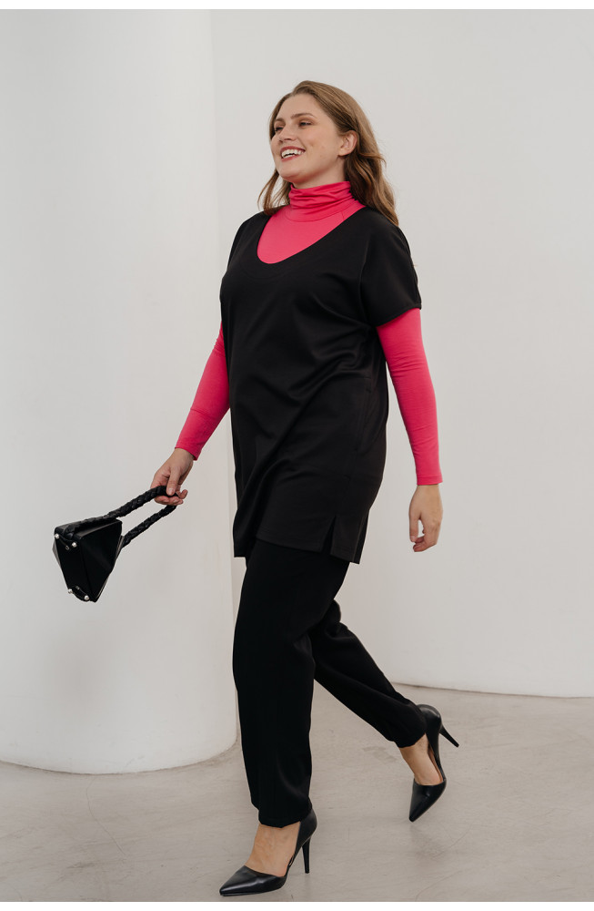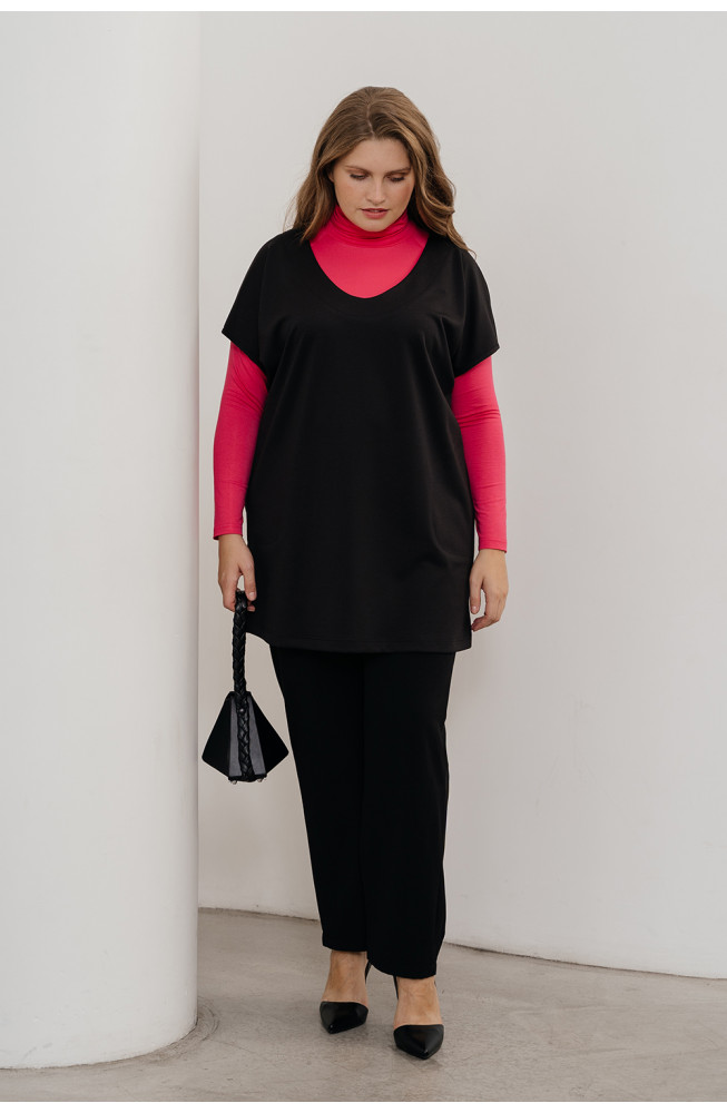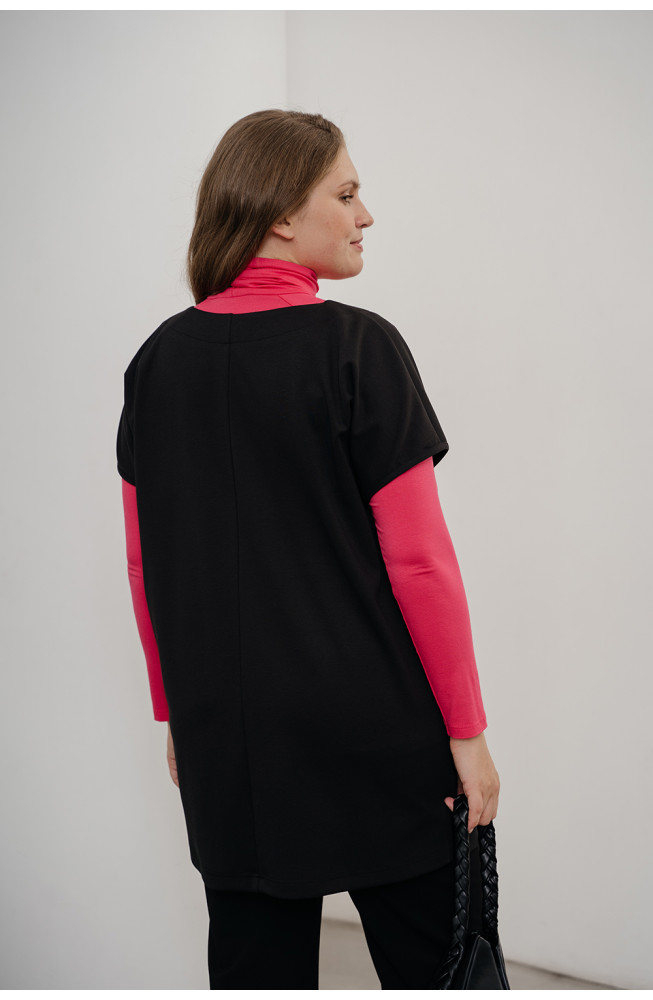 Описание: Жилет из плотного трикотажа джерси силуэта oversize с овальной линией горловины короткими цельнокроенными рукавами с карманами в боковых швах и с небольшими разрезами по бокам внизу.